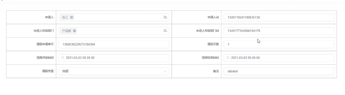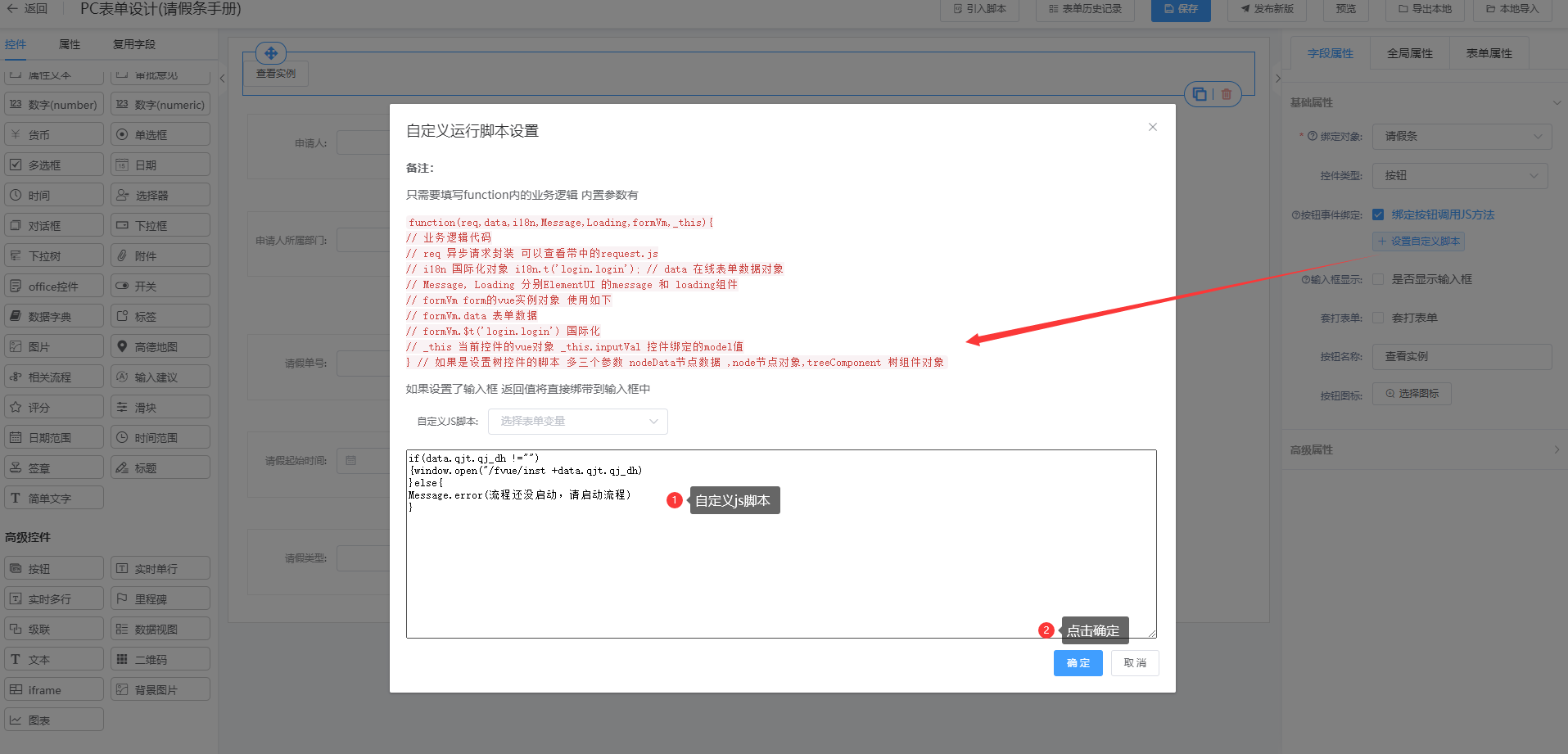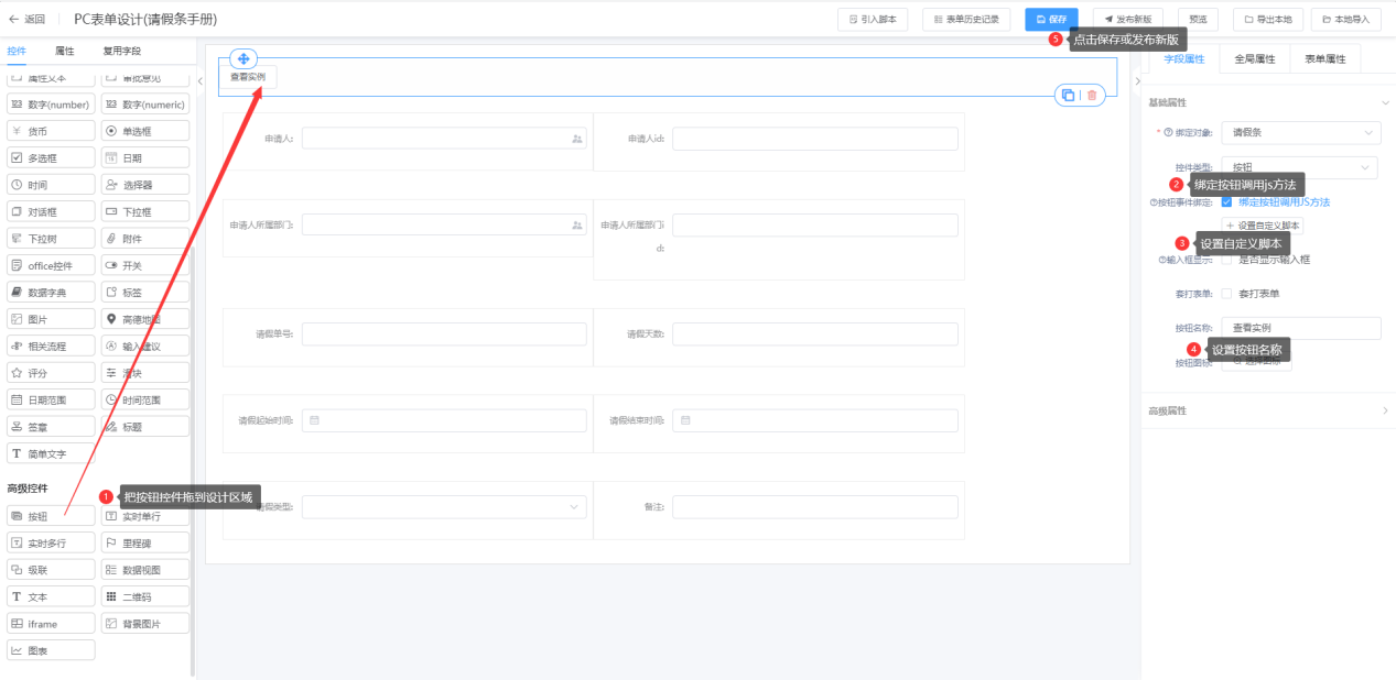 实现实例:启动流程时将实例id存到字段“请假单号”中,表单上配置一个按钮控件,点击按钮时可通过实例id跳转到对应的流程实例上