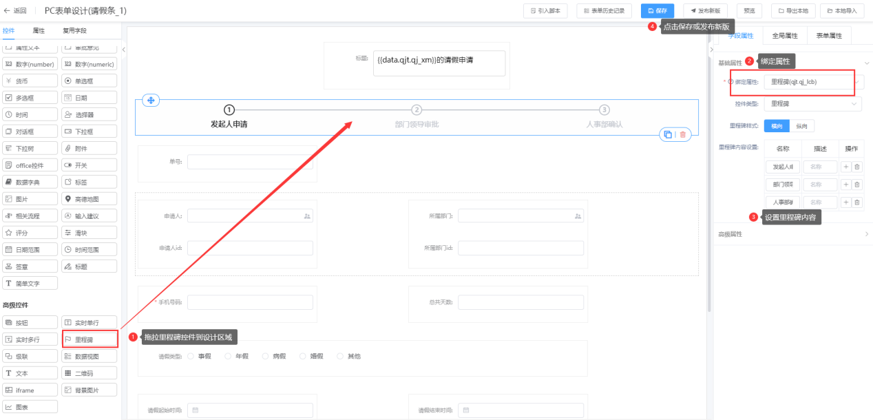 第一步:进入表单设计器页面,将里程碑拖拉到对应的布局中;