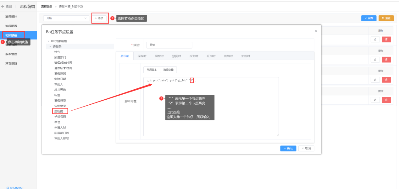 第二步:点击{初始赋值},按节点添加赋值设置,如下图;