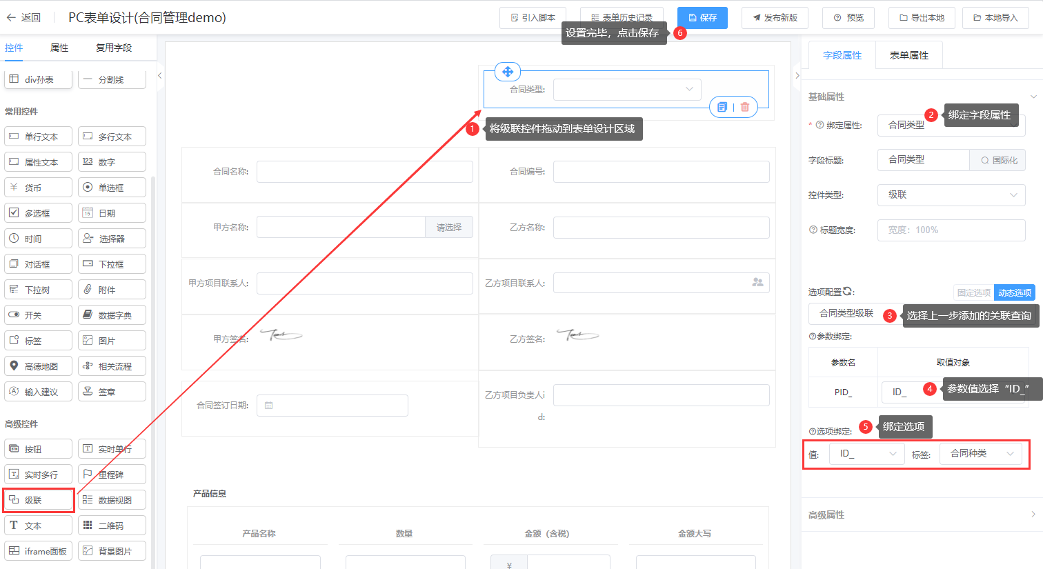 第二步:进步表单设计页面,将合同类型绑定级联控件,并配置关联查询