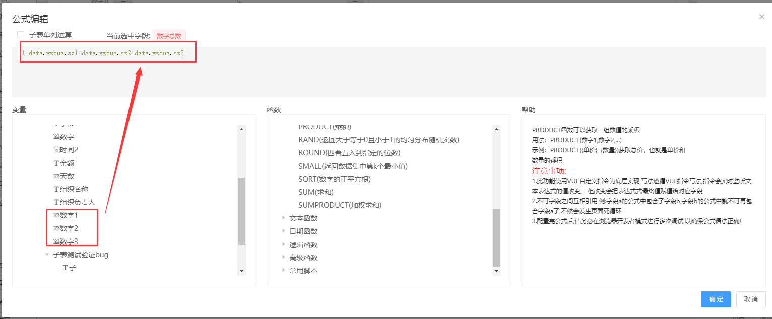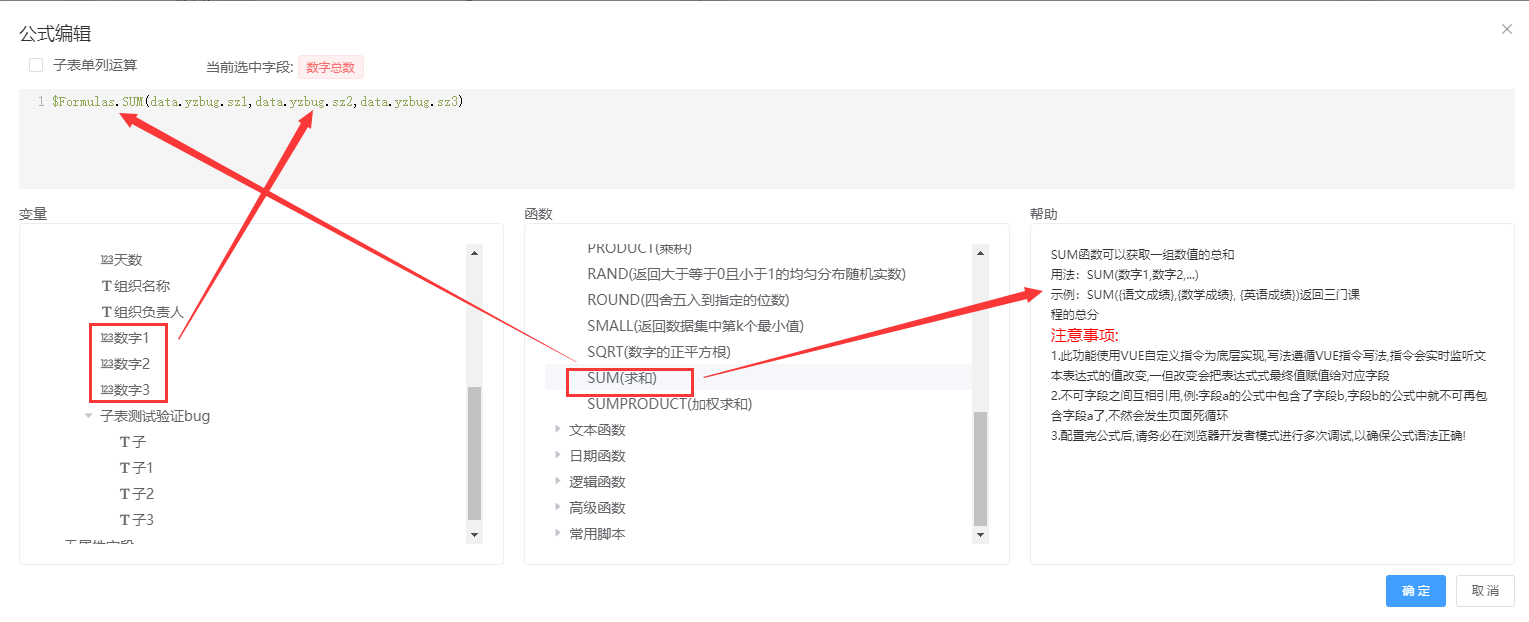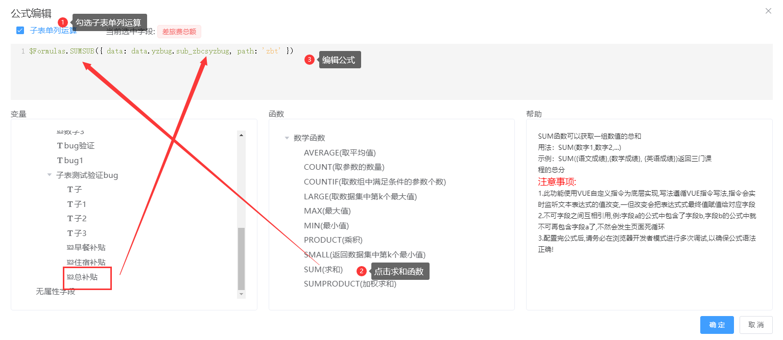 3. 勾选左上方的子表单列运算,并且将子表字段放入到求和公式中