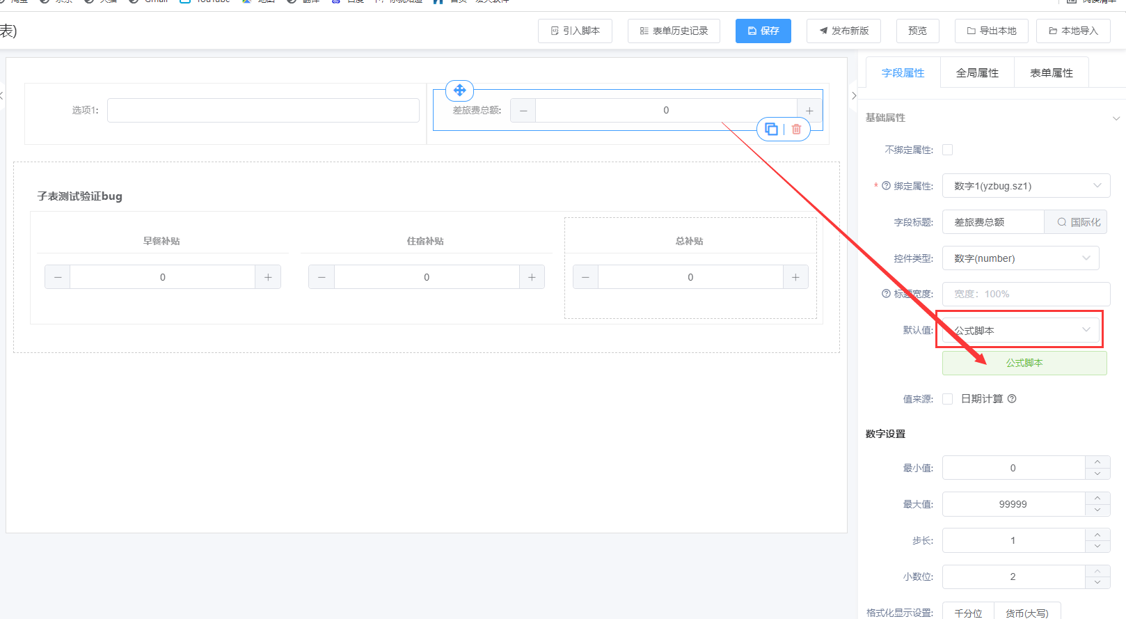 2.选中总计字段,点击右侧【基础属性】,默认值选择自定义,点击公式脚本按钮,进入编写公式页面