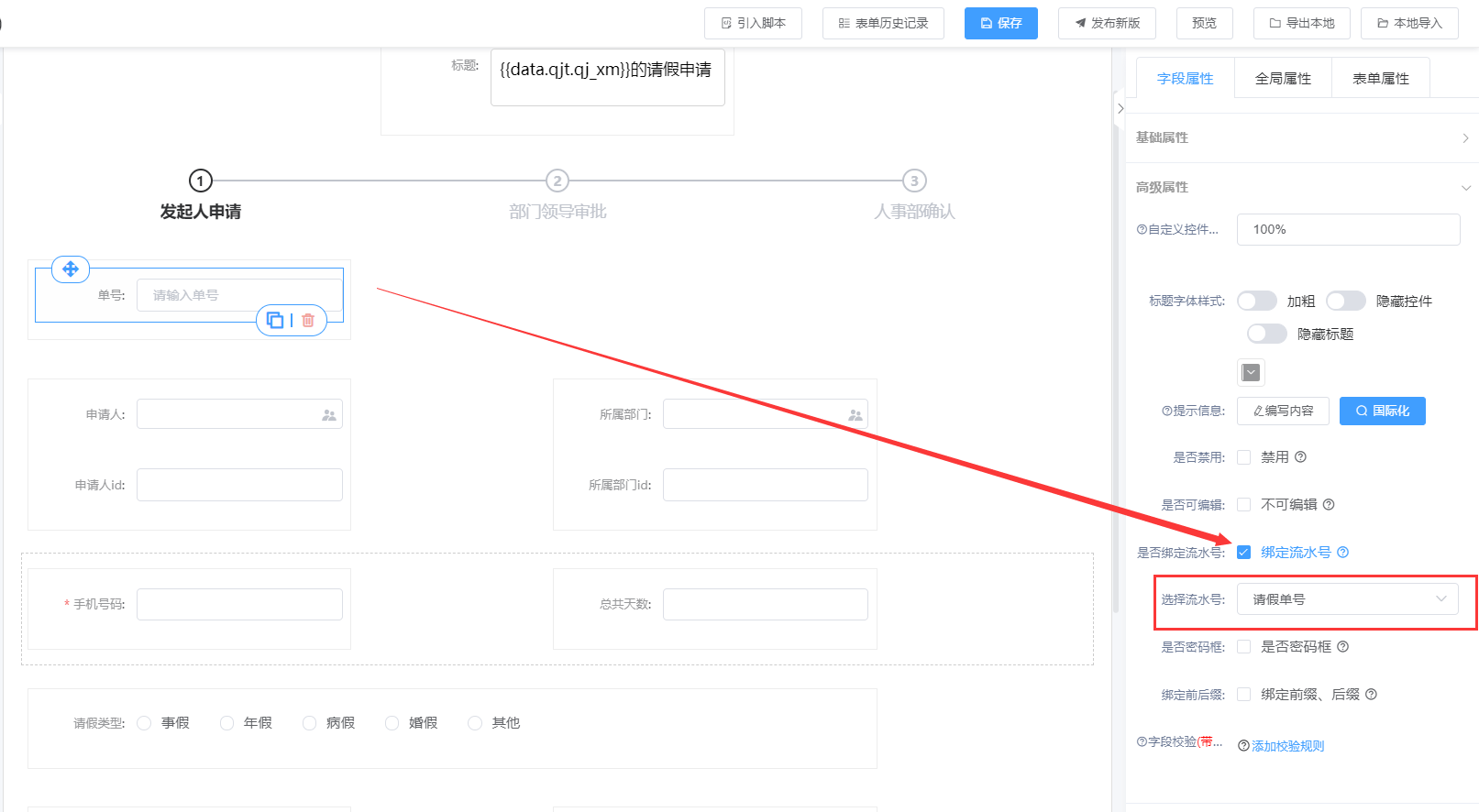 · 绑定流水号:绑定流水号,在打开表单时,可自定按绑定的流水号规则生成流水号