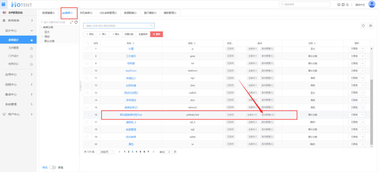 在【PC表单】列表中点击“版本”列的“版本管理”进入表单版本管理页面,在页面中显示表单的所有版本