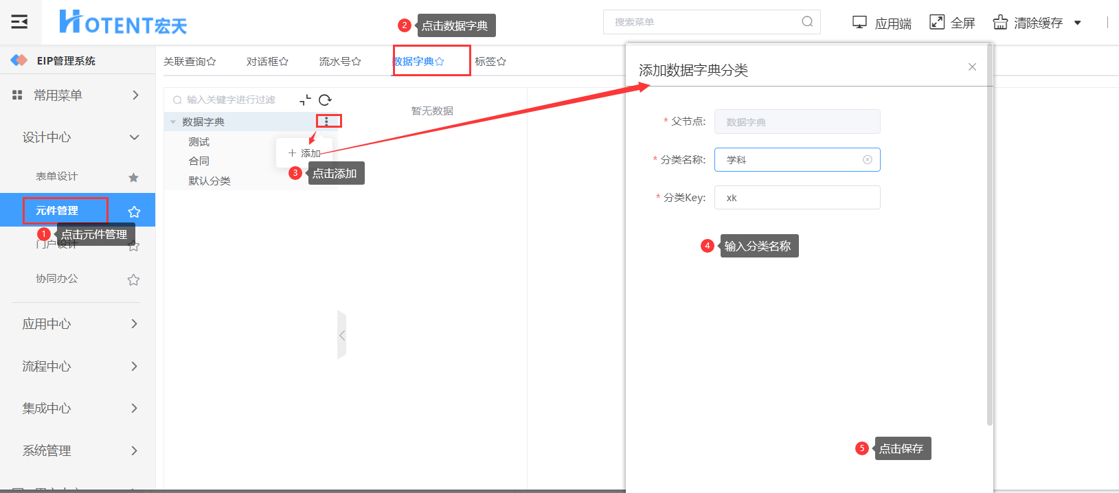 第一步:【设计中心】→【元件管理】→【数据字典】,点击“添加”;
