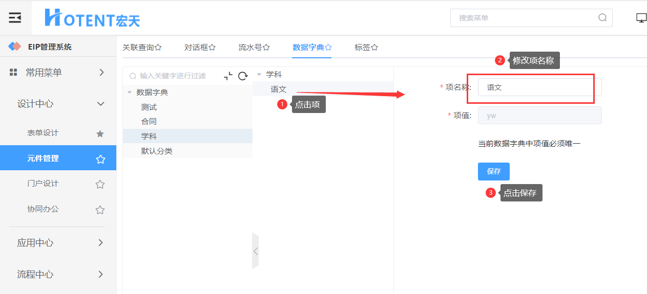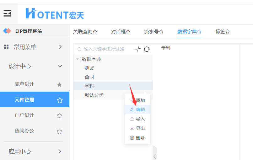 第一步:【设计中心】→【元件管理】→【数据字典】,选择要修改的分类,点击“编辑”;