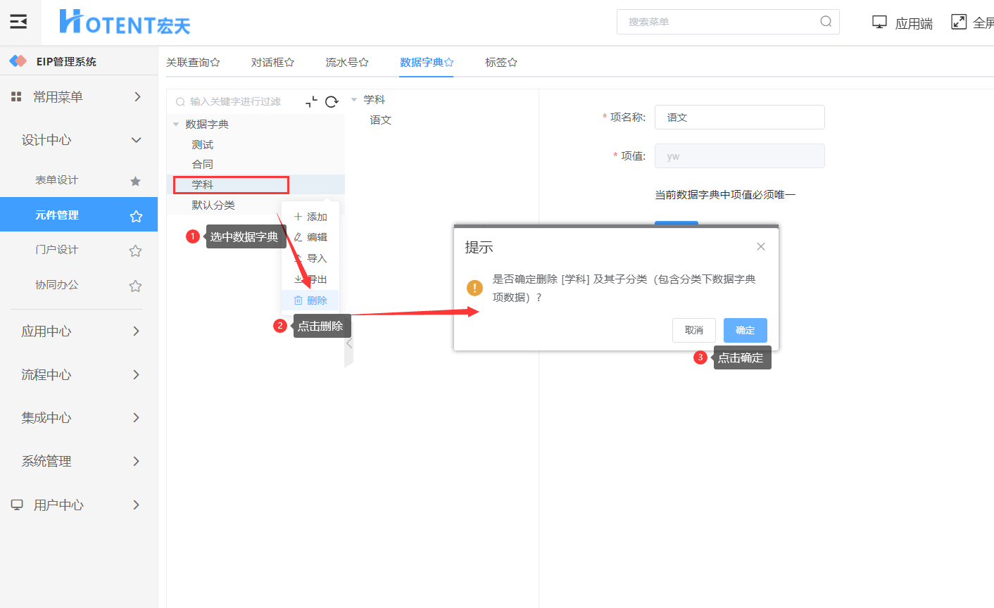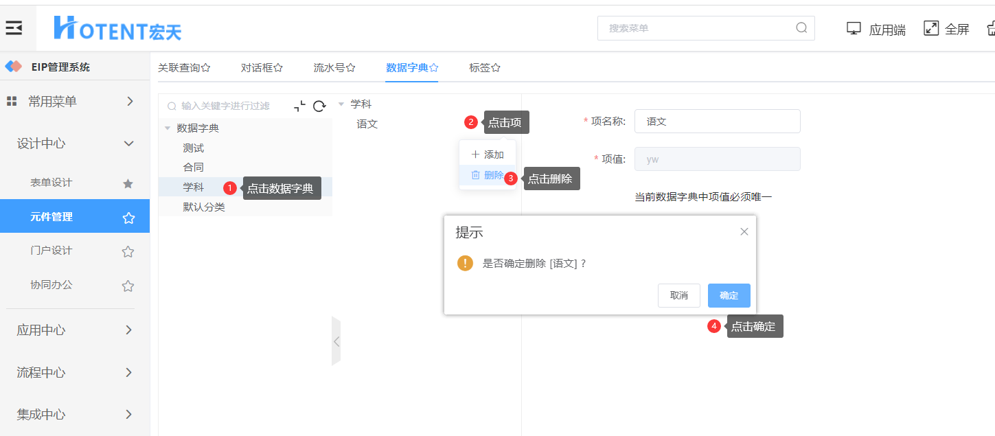 删除数据字典项: