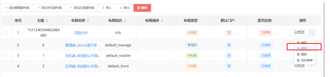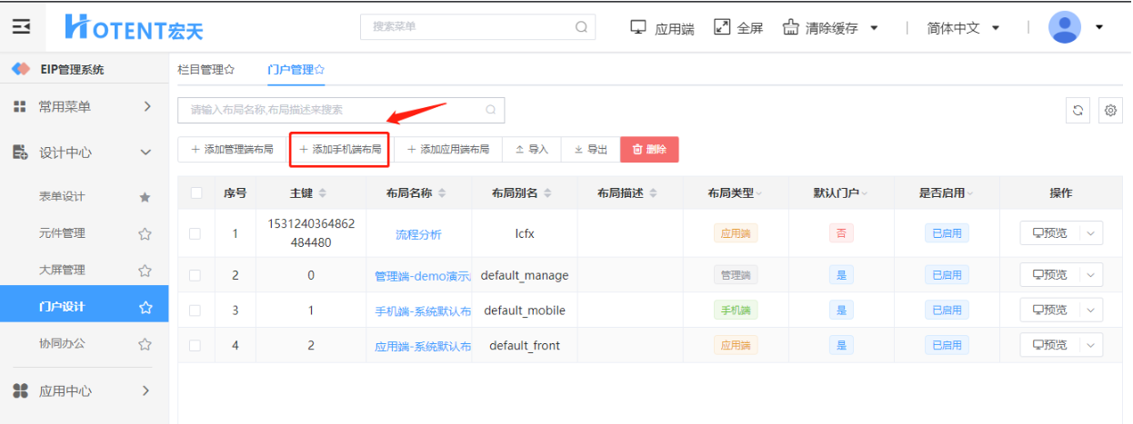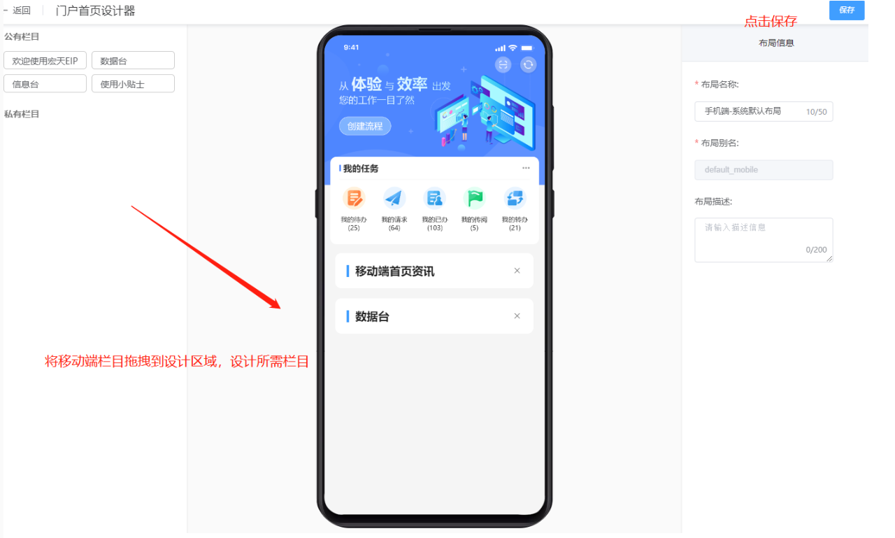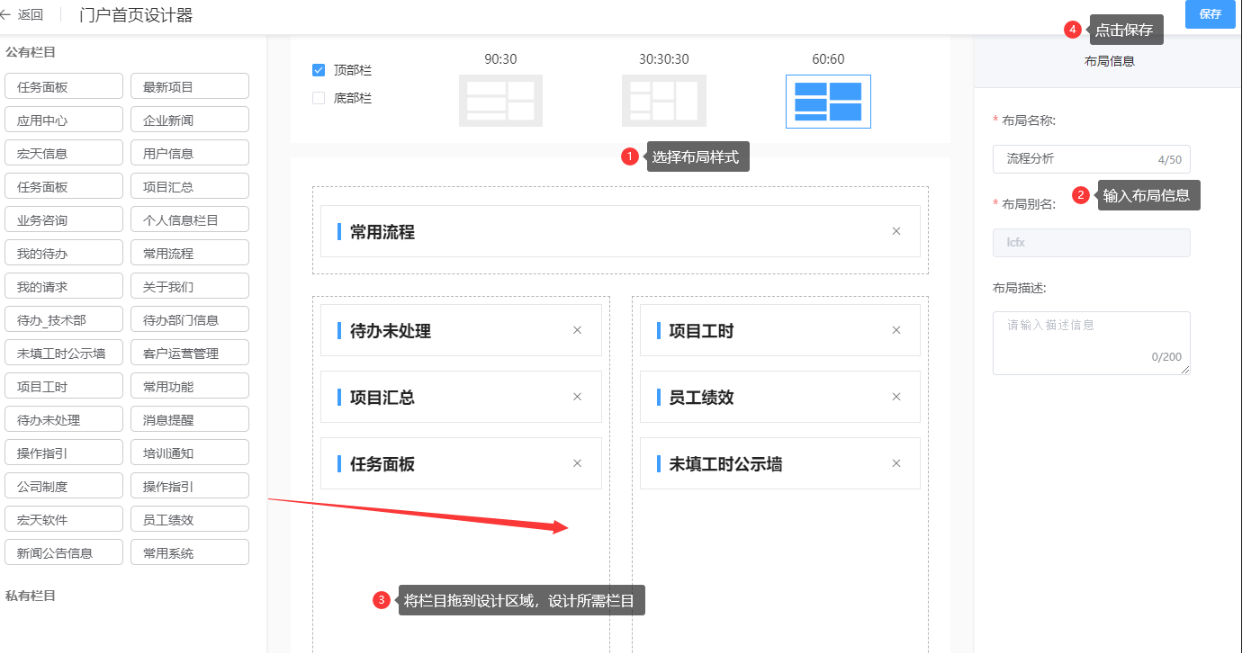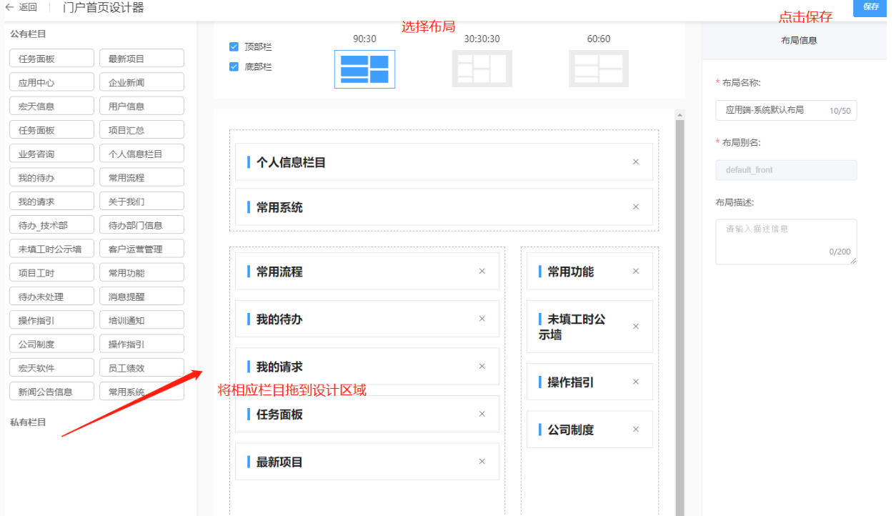 负责应用端、管理端和移动端的门户设计,【栏目管理】创建的栏目在对应的端布局存储。