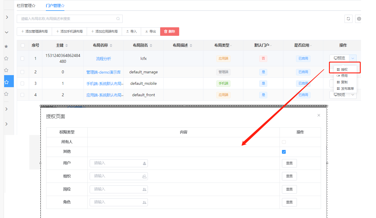• 对门户进行授权,只有有权限的用户才能使用该门户(注意:启用的门户才生效)