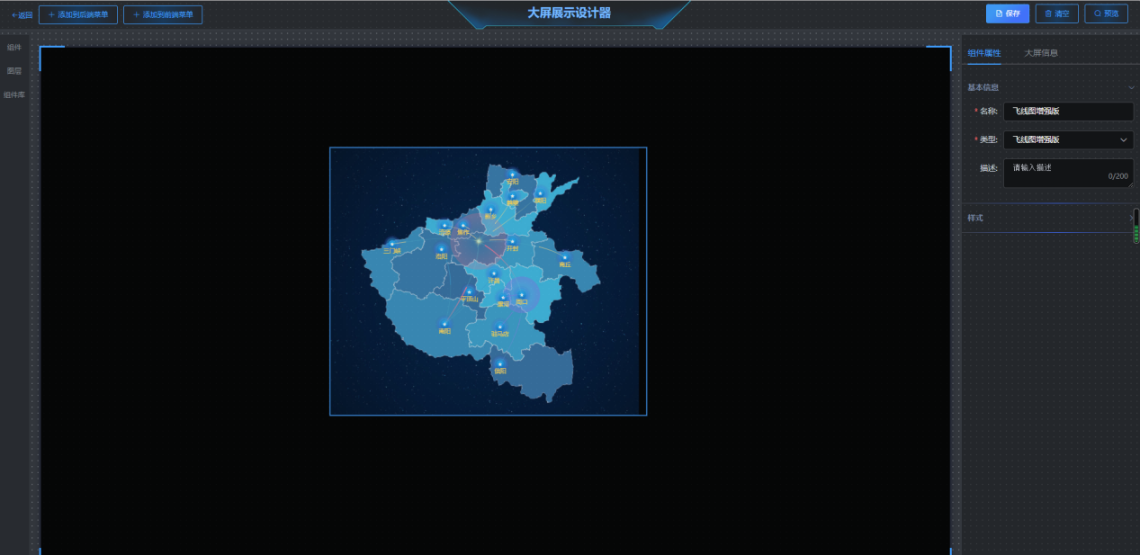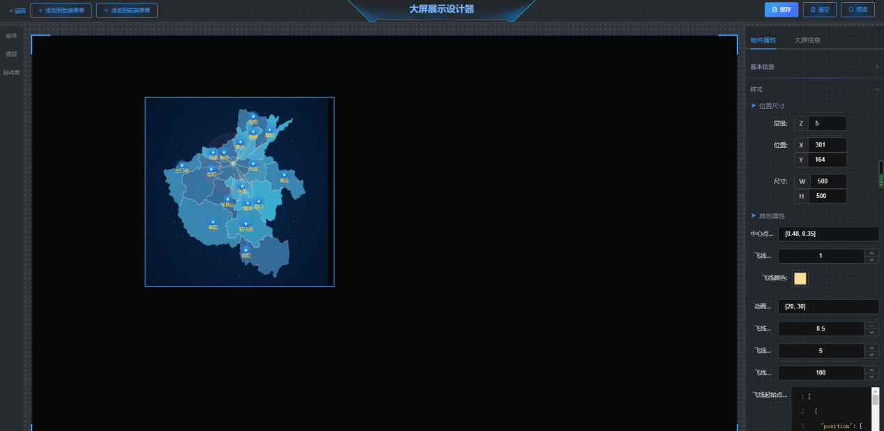 配置若干飞线点后,你可以在任意两点间设置飞线,得到动态飞线图,组件提供的dev模式可以帮你快速配置飞线点位置。如图所示: