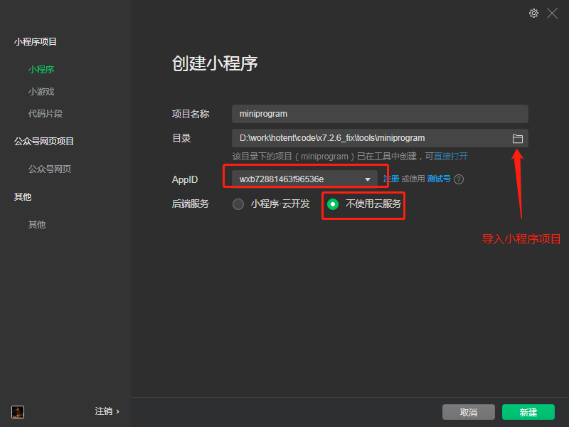 安装好开发工具后,将项目按照下图所示导入到开发工具中,项目路径在eip项目代码的tools/miniprogram目录下。