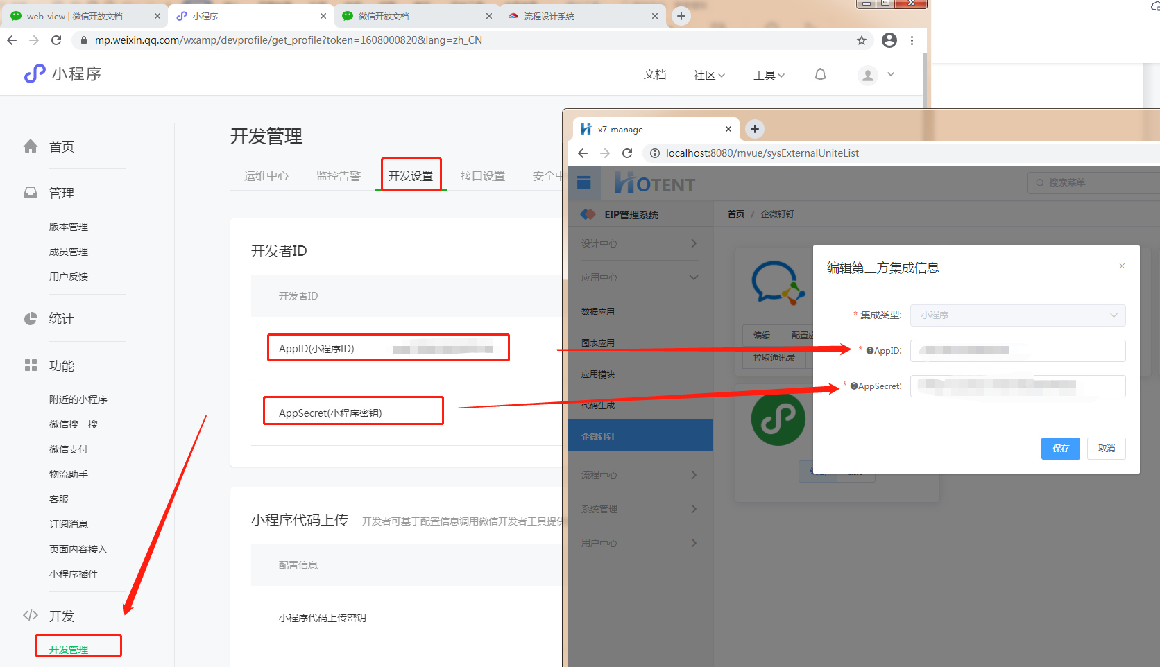 账号申请成功后,将小程序的AppID和AppSecret配置到eip系统中,注意字符串前后是否有空格。如下两张图所示: