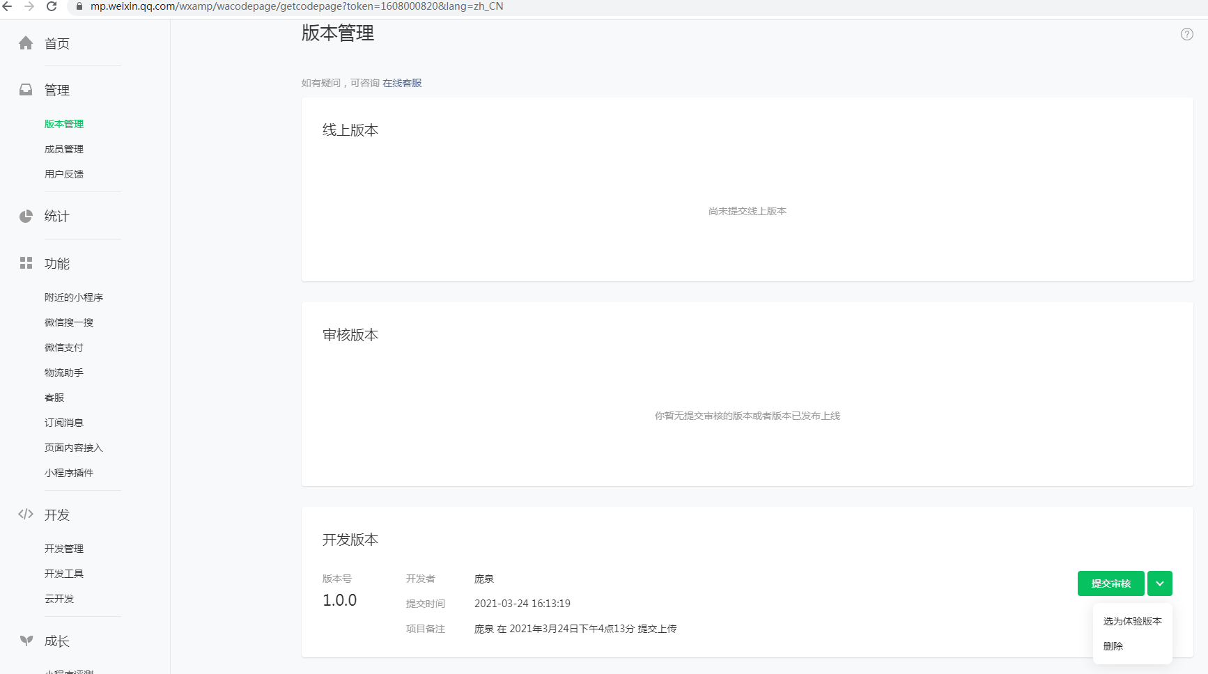 提交成功后,将在小程序管理后台的开发版本上,看到刚提交的版本。可以设为体验版,或者提交审核。