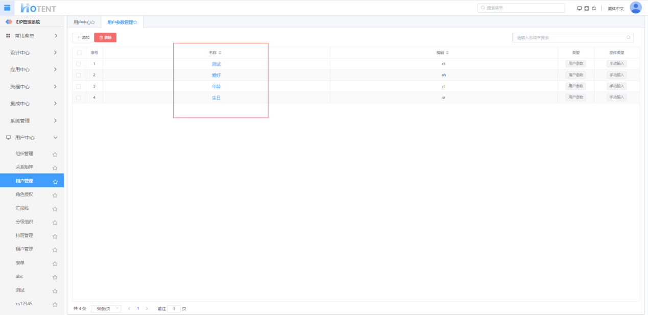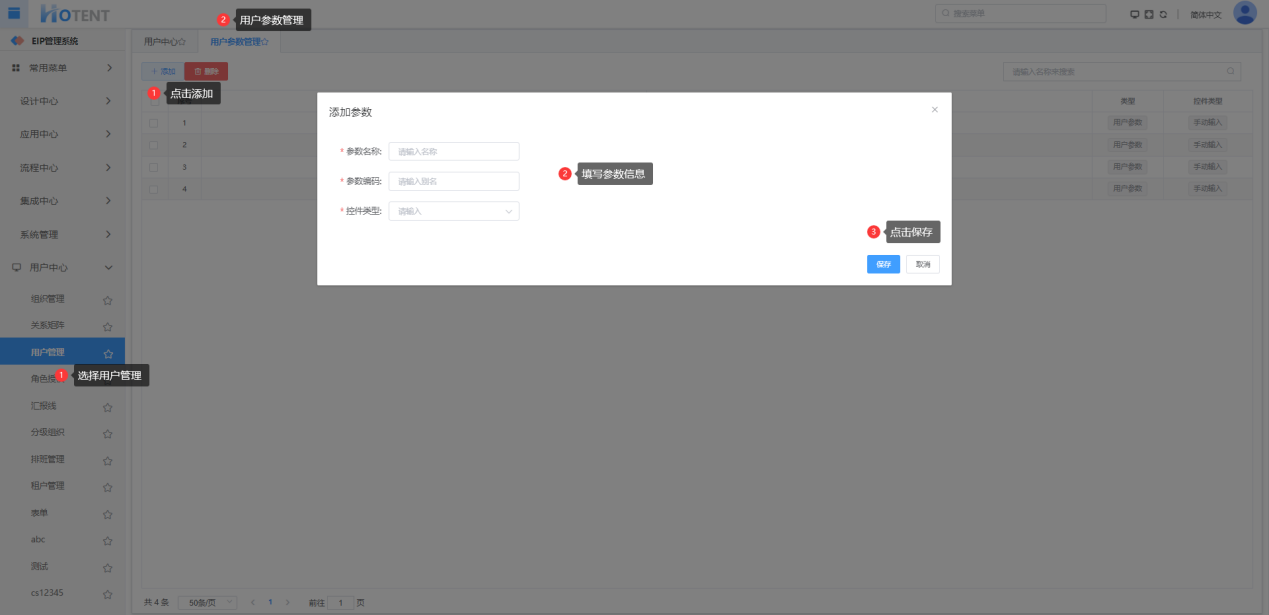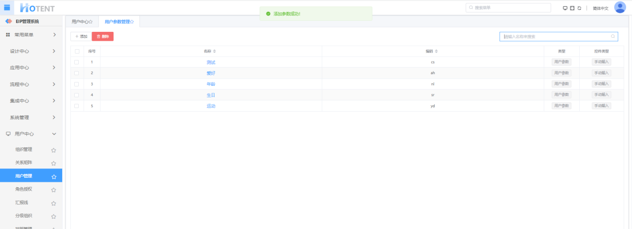 操作:【组织架构】→【组织管理】→【用户参数管理】→单击“添加”→填写参数信息→单击“保存”