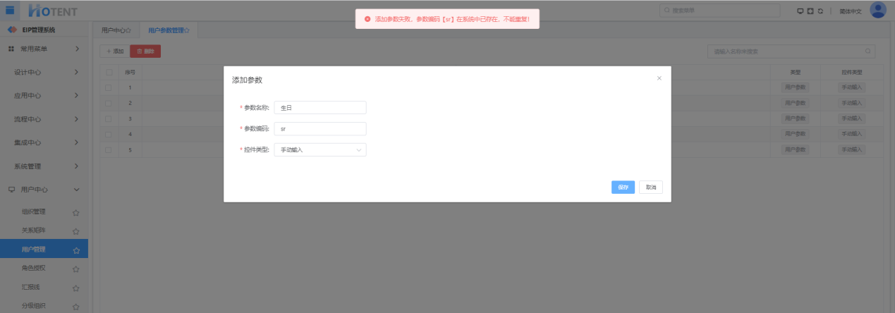 注:『添加参数』中字段“参数名称”、“参数编码”、“控件类型”均为必填。参数编码唯一,如出现重复编码将保存失败,如下图所示