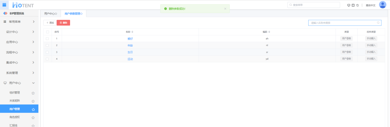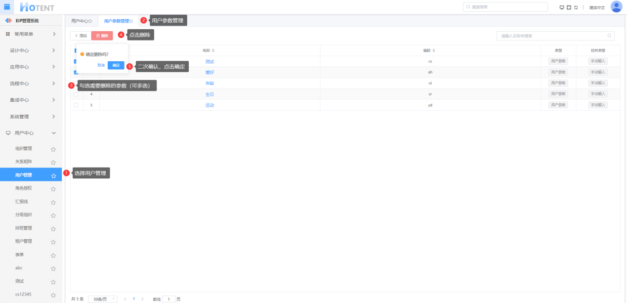 操作:【组织架构】→【组织管理】→【用户参数管理】→勾选用户参数项,单击“删除”→单击“确定”