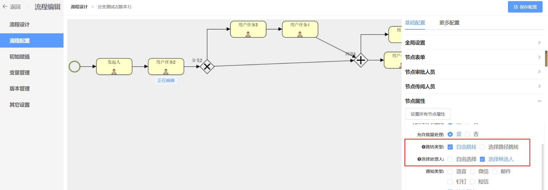 参数值可通过流程节点属性配置:自由跳转/选择候选人