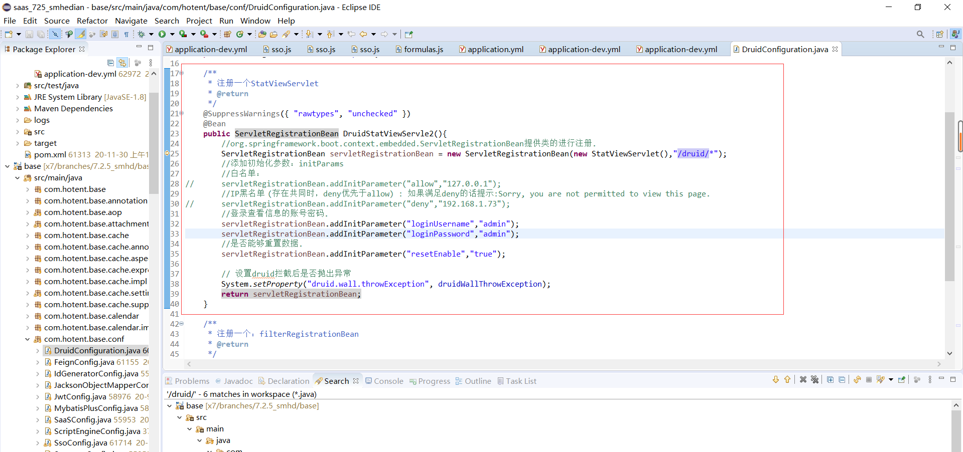 代码文件中找到DruidConfiguration.java文件,将下图红框中的代码删除或注释即可,如需修改账号密码,可将loginUsername和loginPassword对应修改