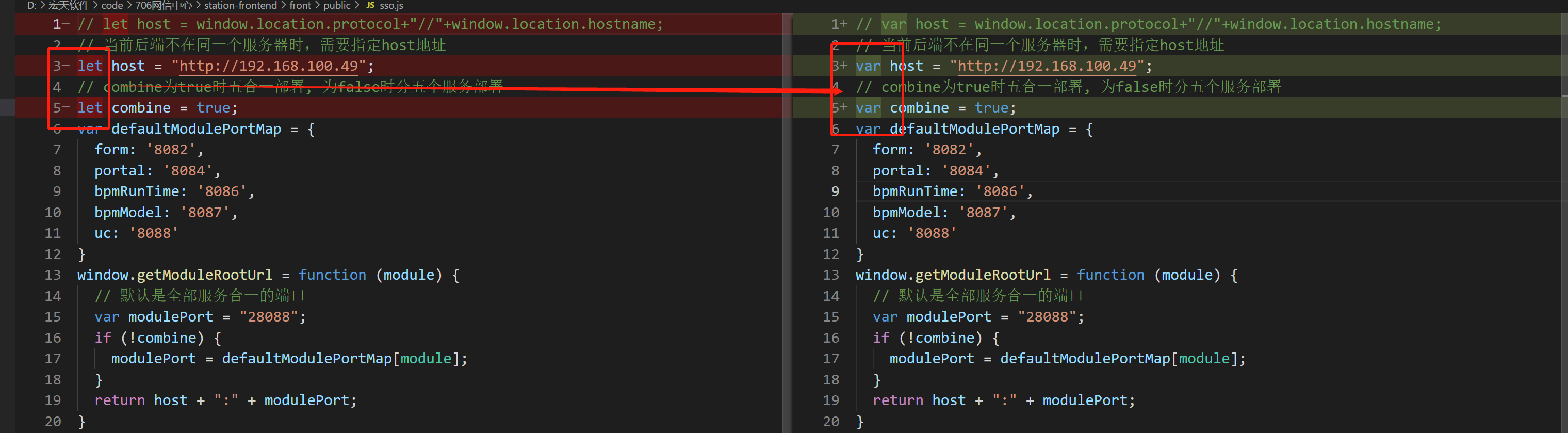 Manage端、front端、mobile端中,在public目录下找到config.js或者sso.js这种配置文件,将配置文件中的let变量声明,改为var。都修改完成后,可以先尝试项目是否可以正常运行,如果还不行,可以看报错信息分析下面的兼容方向。报错不容易解决时需要进行后面的深度修改。