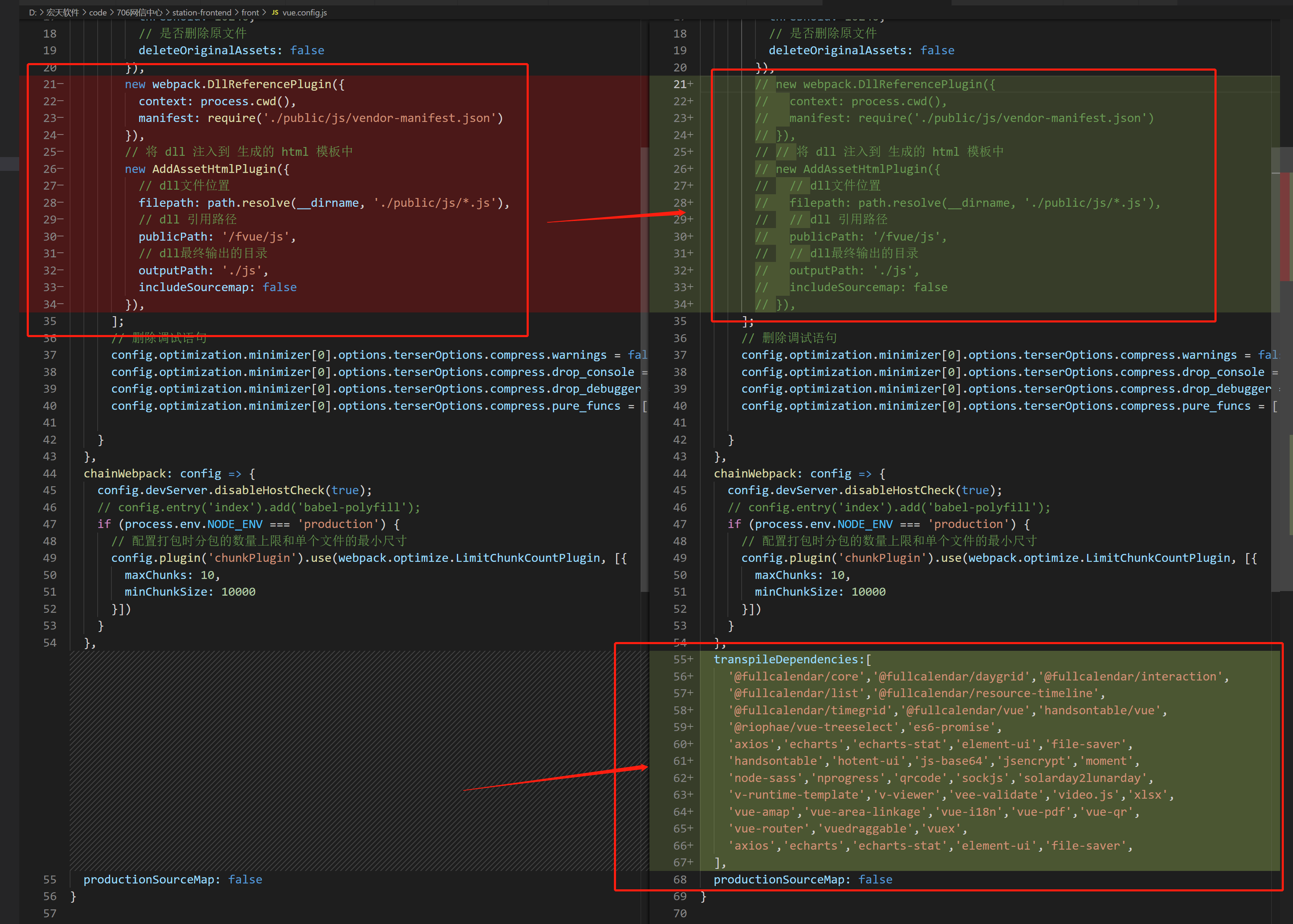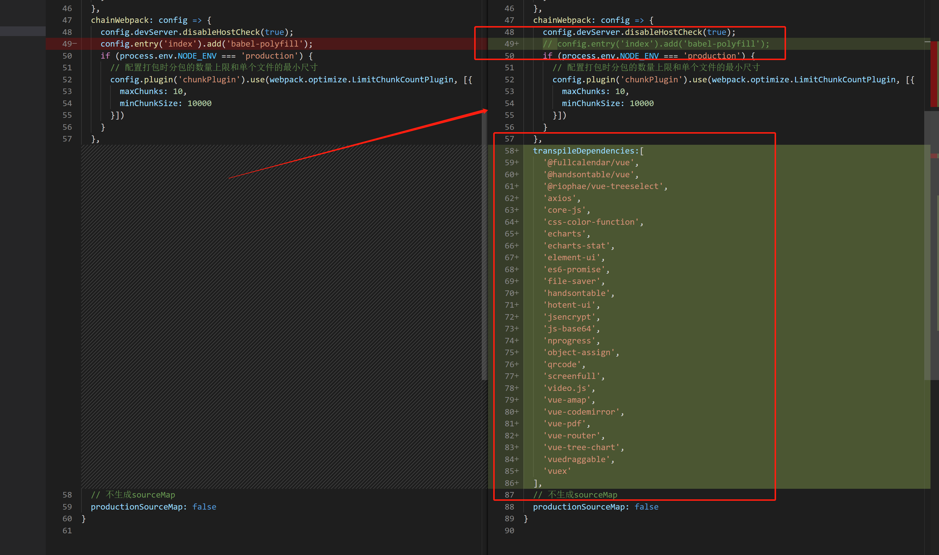 深度修改,是修改webpack配置,打包时将代码转换成低版本格式。尤其是使用transpileDependencies更改了第三方依赖的代码格式。以下为修改文件和修改内容。