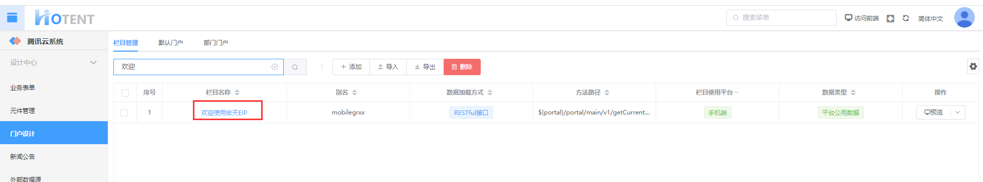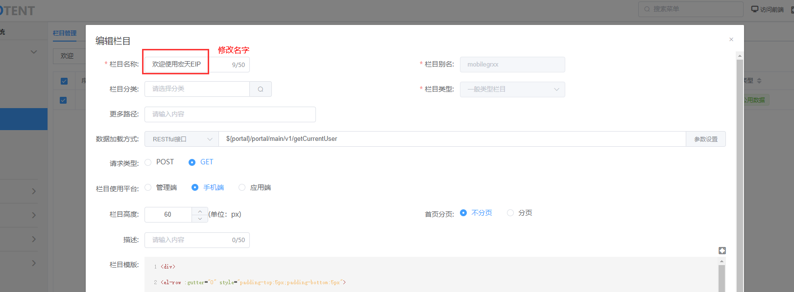 修改配置-->登录管理端,找到门户设计下的栏目管理