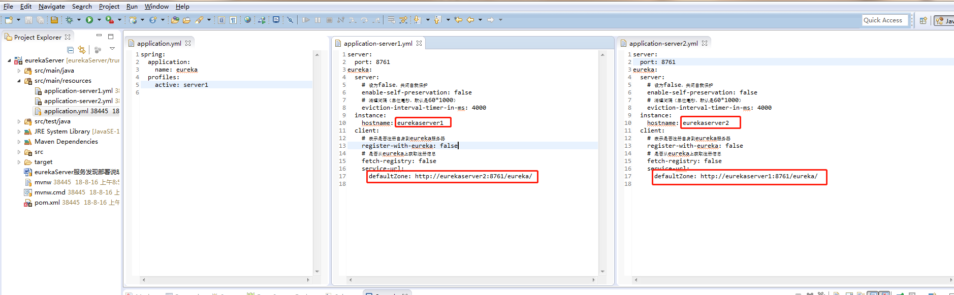 在eurekaServer下创建两个application-server1.yml和application-server2.yml文件。配置内容如下: