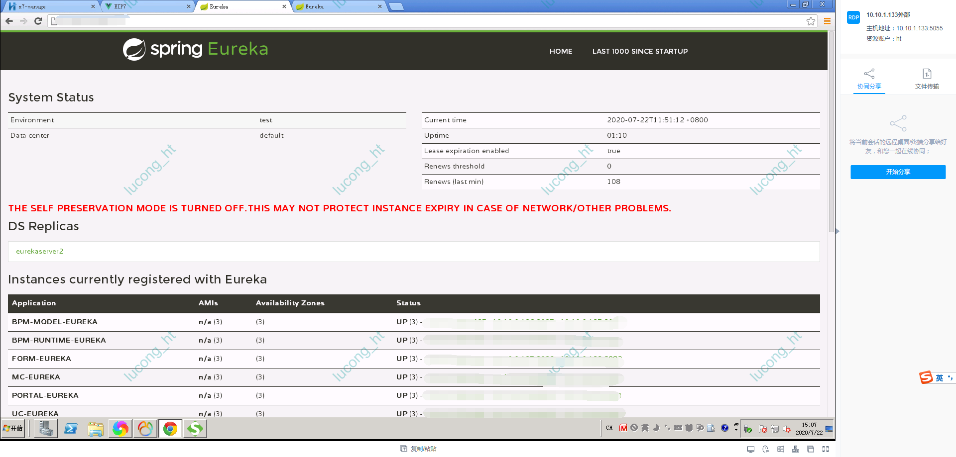 方法二:打开eurekaServer页面(http://255.255.255.0:8761/或http://255.255.255.1:8761/),可以查看具体机器具体的微服务情况。如下图所示:三台机器上的服务均正常启动。