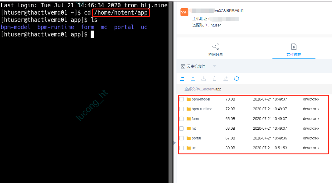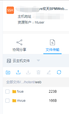 将步骤(2)打包好的dist上传至255.255.255.0服务器的/home/hotent/web目录下,并将管理端的dist目录更名为mvue,应用端更名为fvue 。