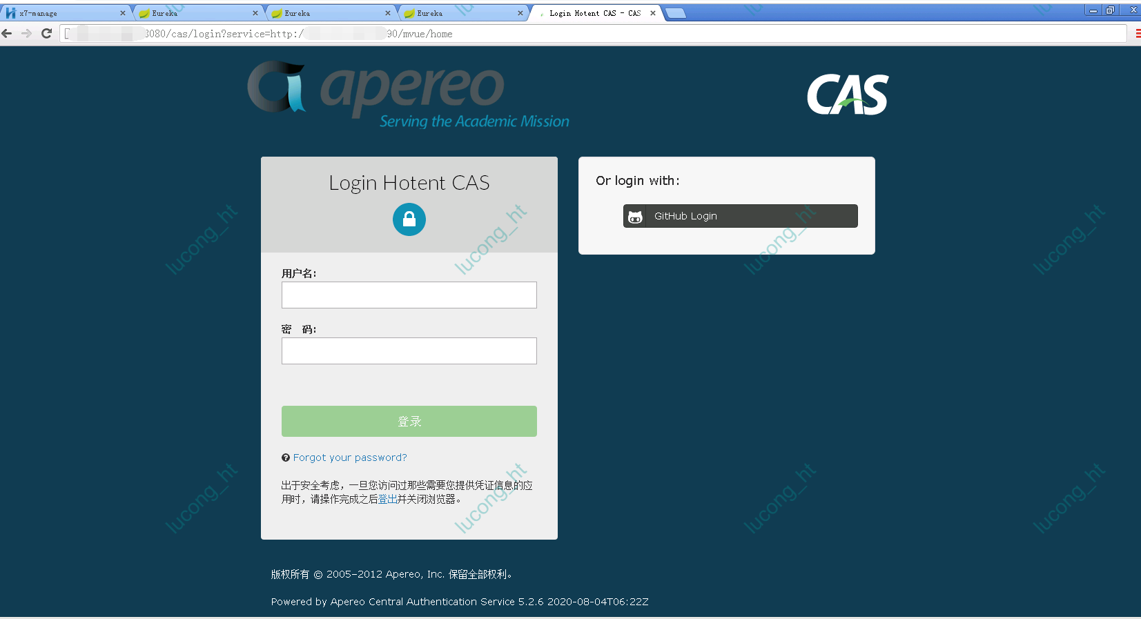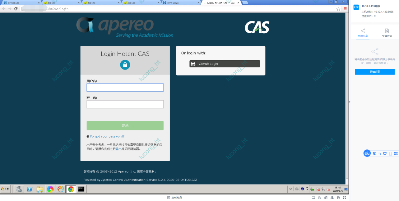 浏览器访问:http://255.255.255.0:8080/cas/login(如下图),输入账号密码成功登陆则说明cas运行成功。