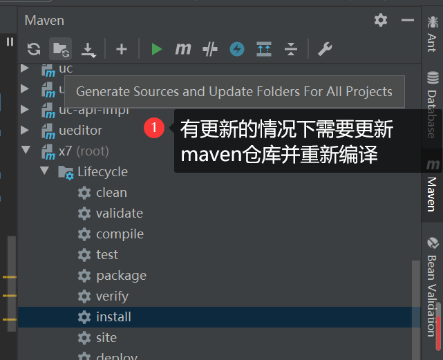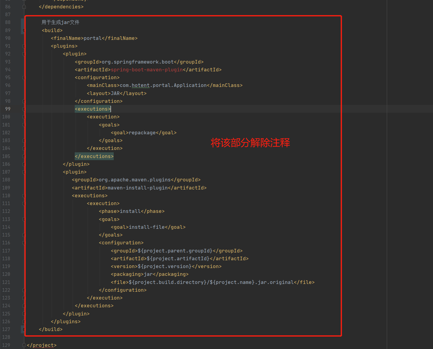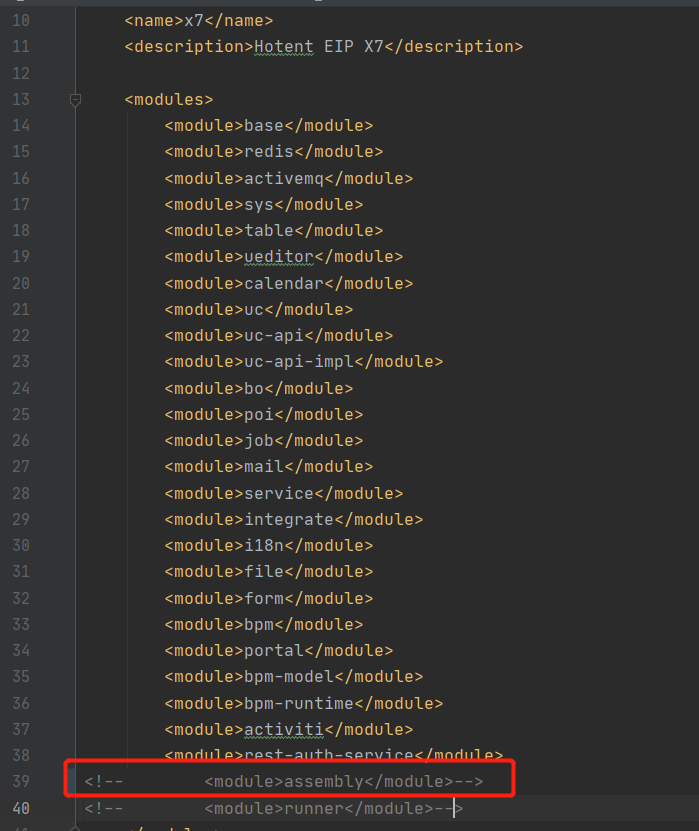将每个服务(bpm-model/bpm-runtime/uc/portal/form)下的pom.xml文件中的<build>模块开放(选中需要解开注释的部分,shift+ctrl+/)