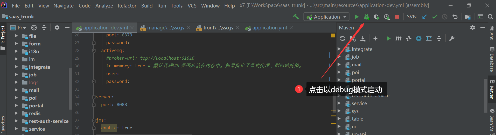 修改base下的application-dev.yml,修改Redis/JMS的相关配置