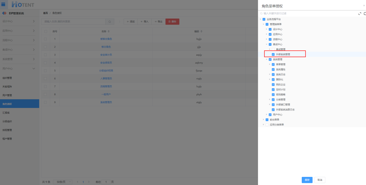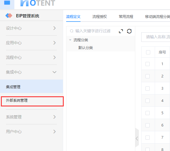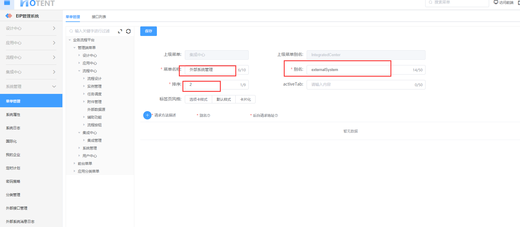 比如我们要在集成中心目录下新建一个“外部系统管理”菜单,那么我们需要在“菜单管理”进行配置