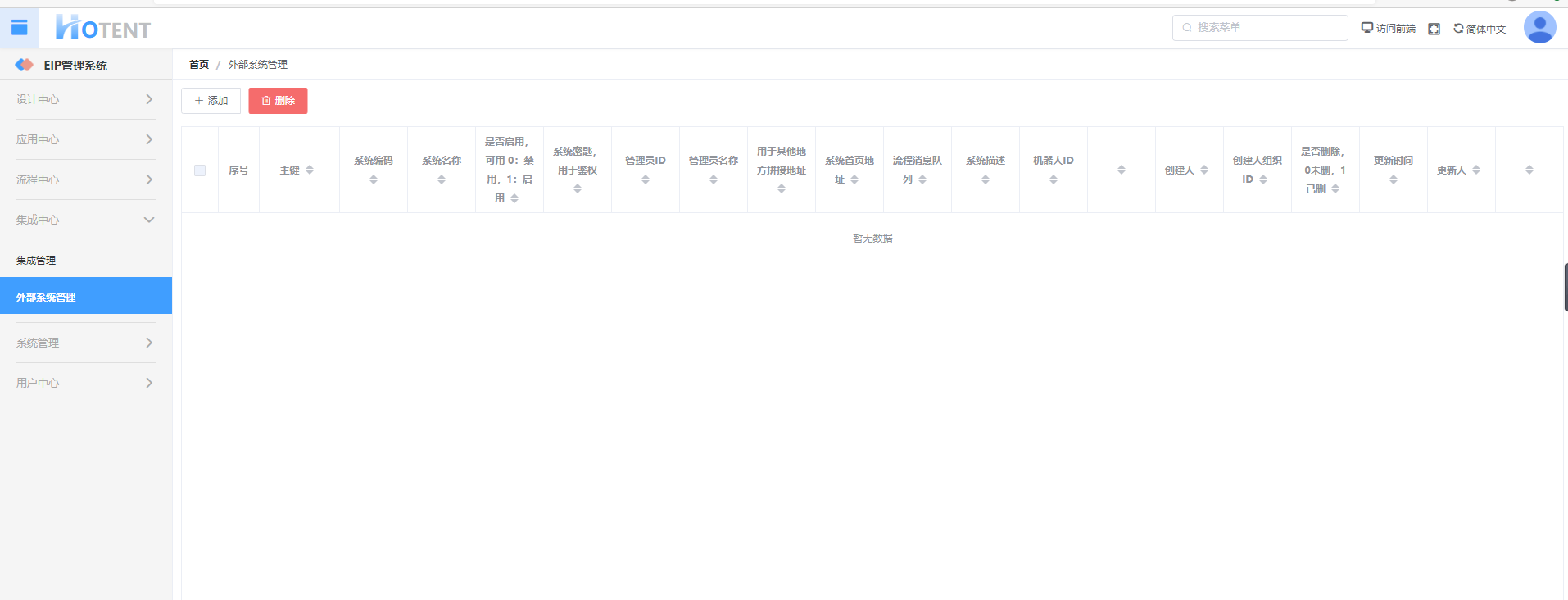 现在我需要快速开发一个关于“外部系统管理”的功能,功能为最基本的增删改查。