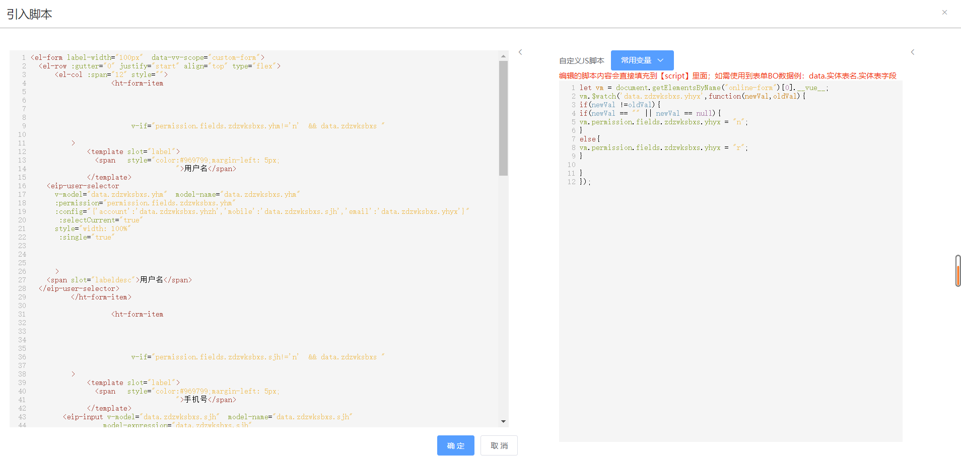 第二步:在表单编辑页面点击按钮“引入脚本”,填写以下内容: