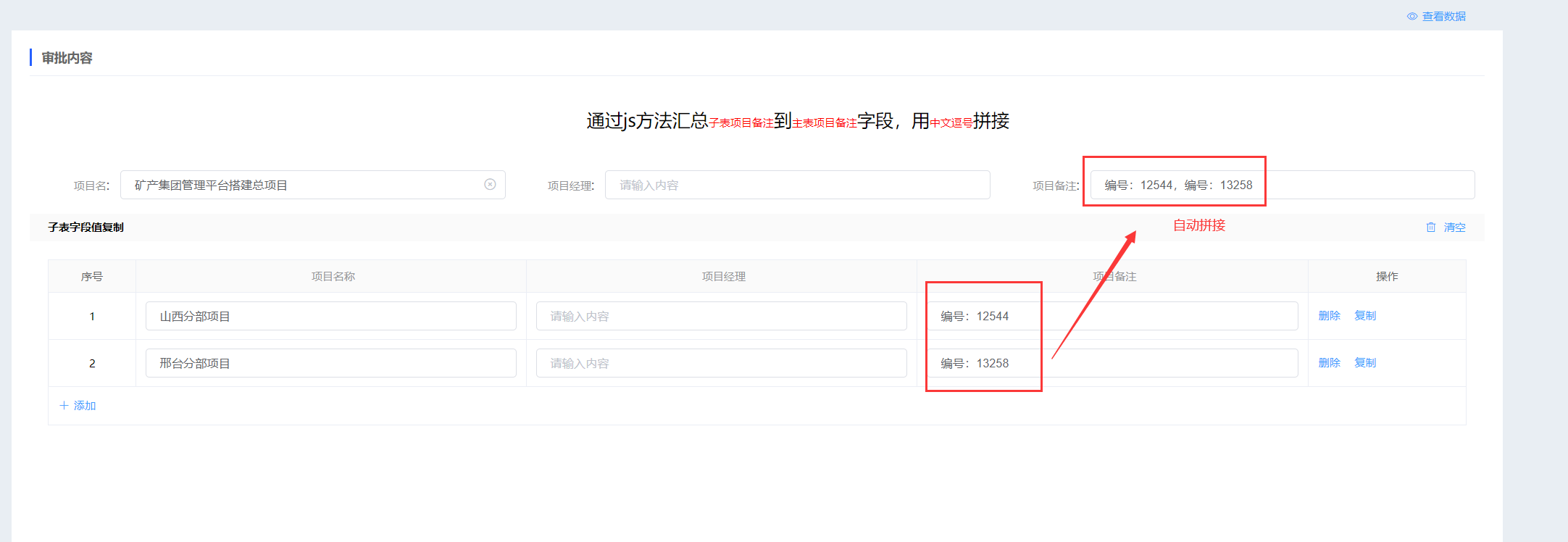 项目信息中,总项目需要获取子项目的所有备注信息进行汇总