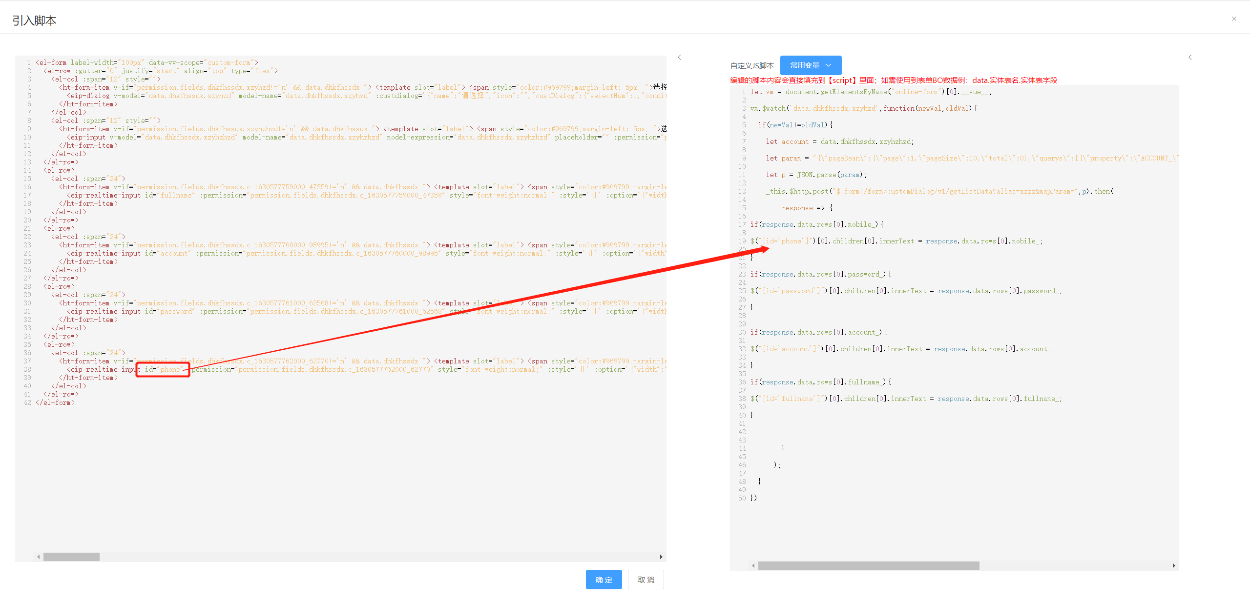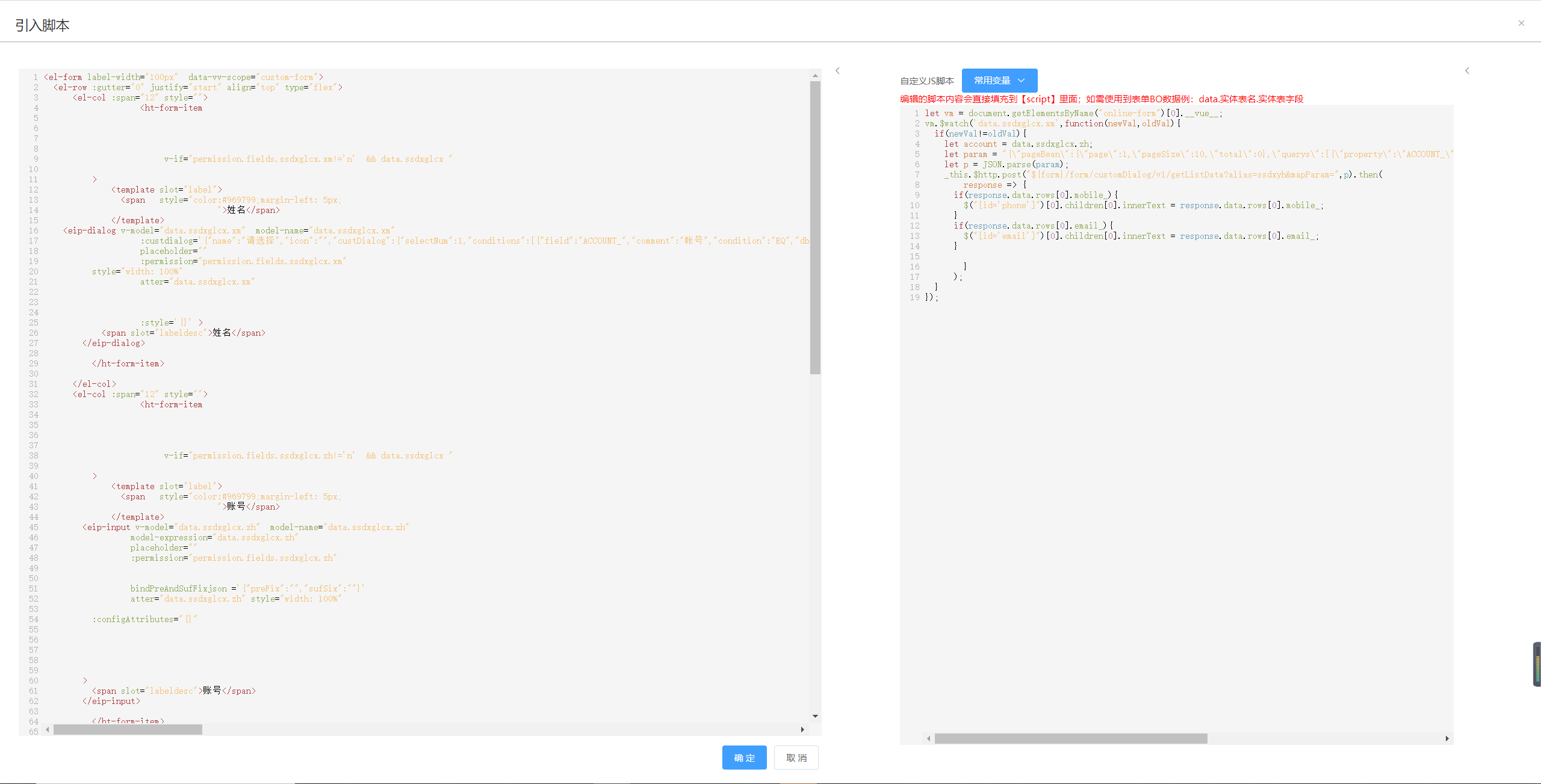 第二步:在表单编辑页面点击按钮“引入脚本”,填写以下内容:
