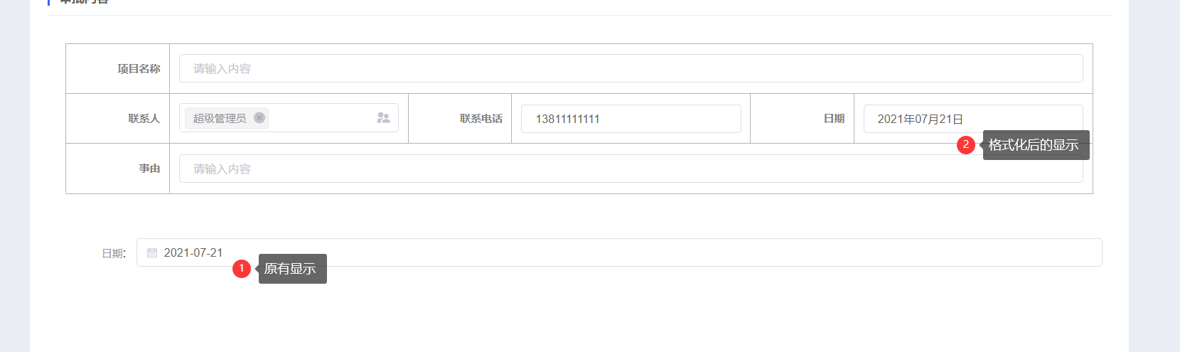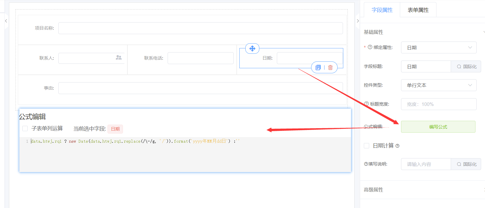 日期控件默认显示格式为YYYY-MM-DD,如果希望显示为YYYY年MM月DD日,可以通过编写公式处理