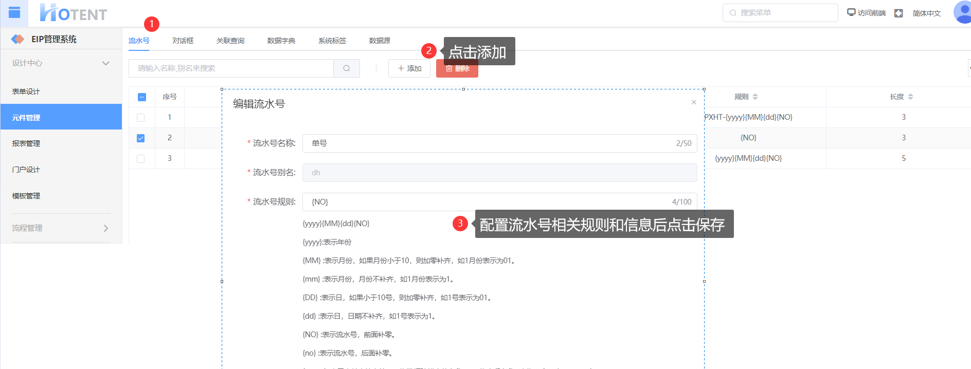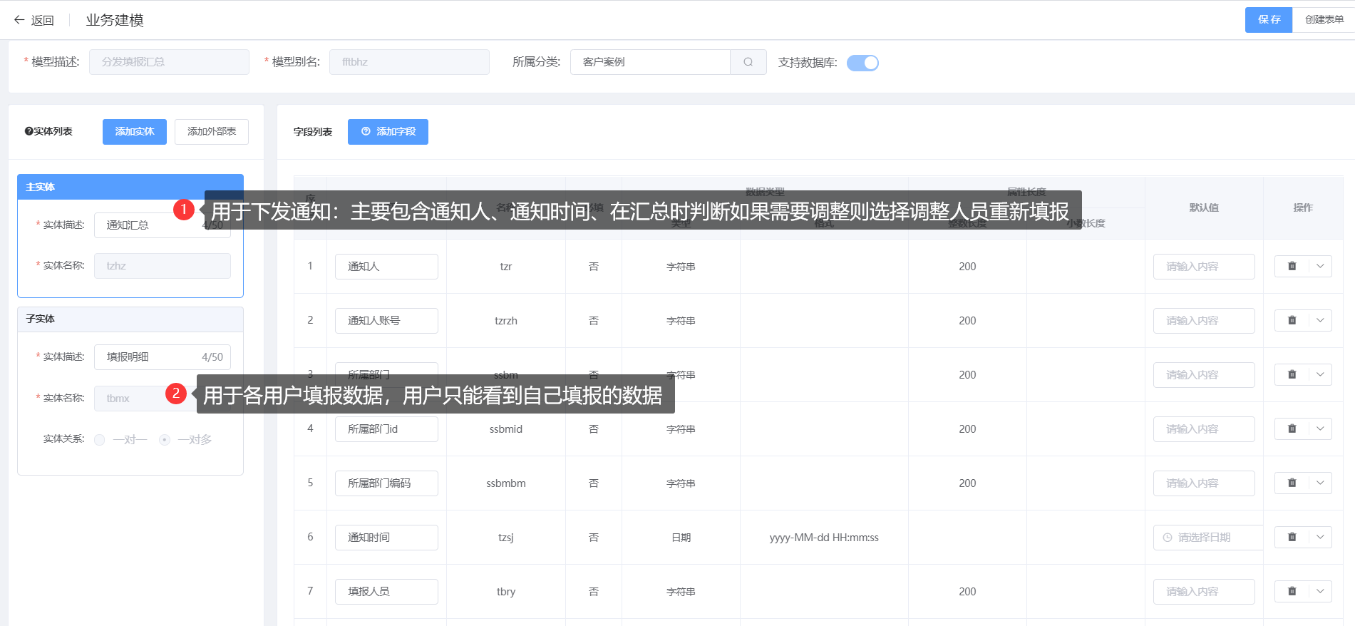 注:设计字段时可额外设计一些辅助字段(唯一性标识字段),用于流程配置时进行数据过滤/数据授权等,辅助字段如:用户账号、组织id/编码等