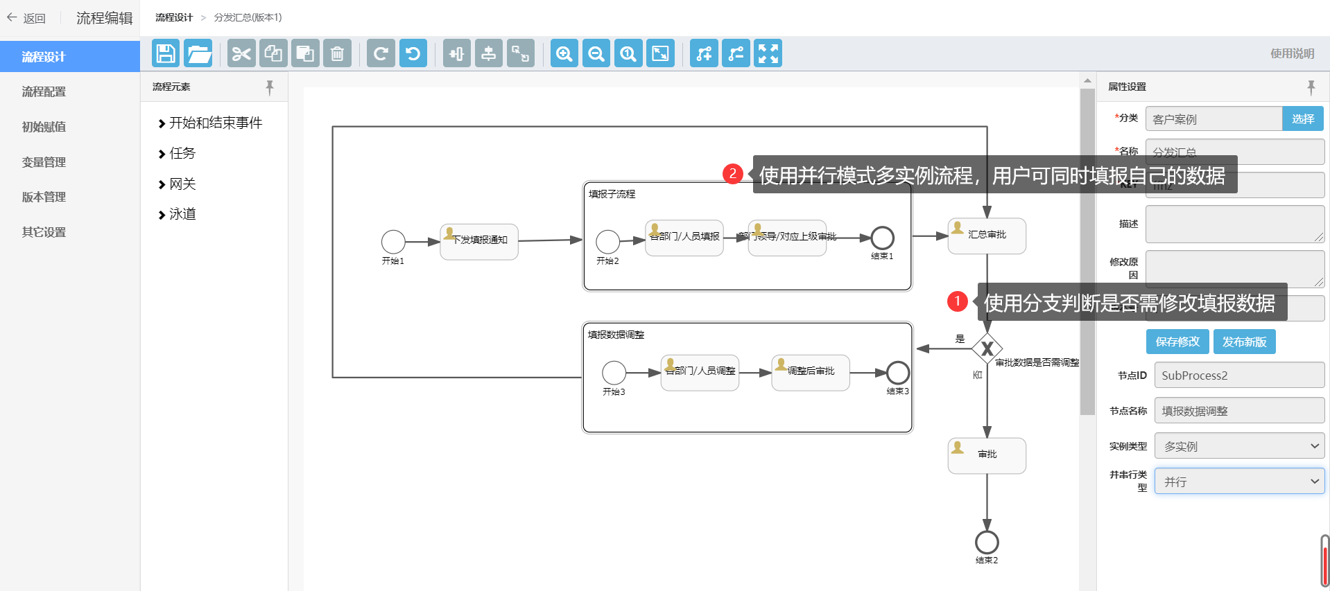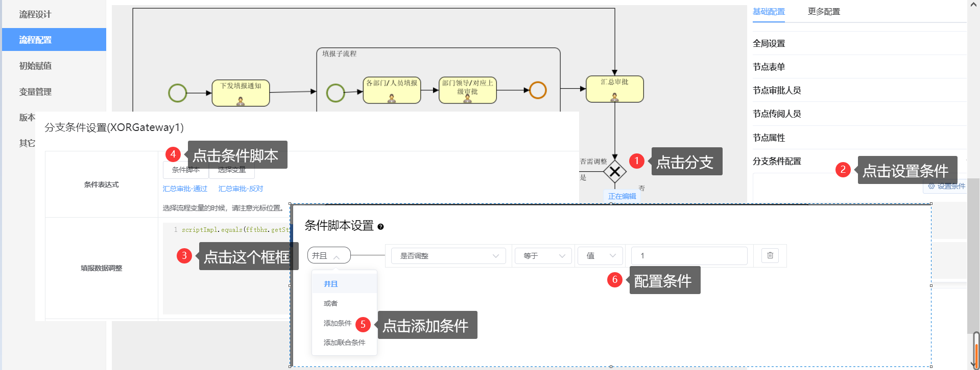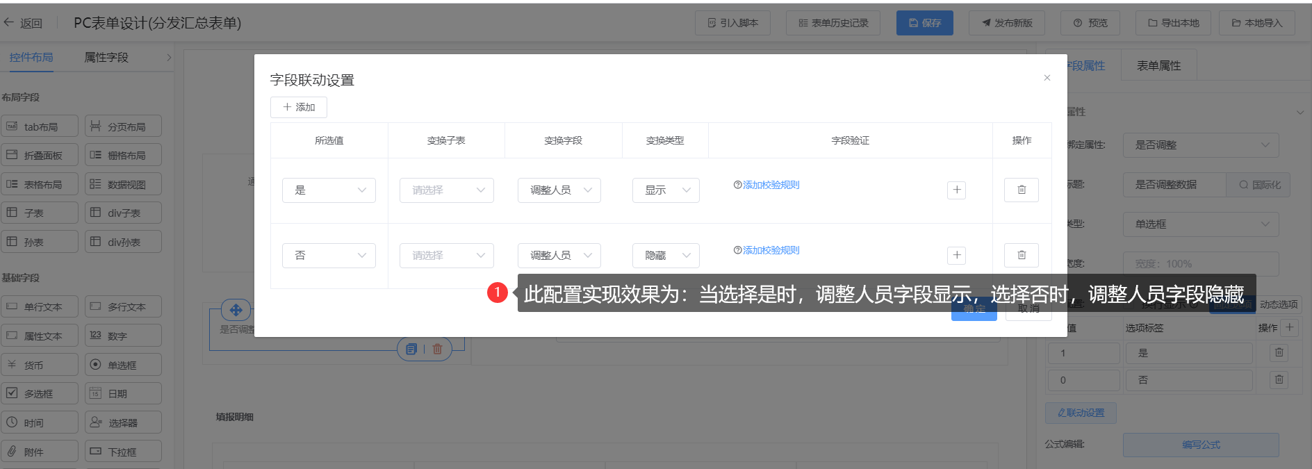实现效果:当选择“是”值为1时跳转导填报数据调整,当选择“否”值为0时跳转下一节点审批