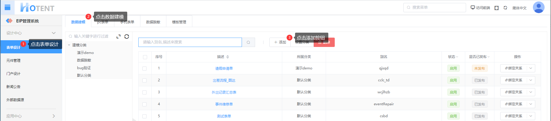 第一步:进入【数据建模】页面,点击“添加”按钮,打开添加建模页面;