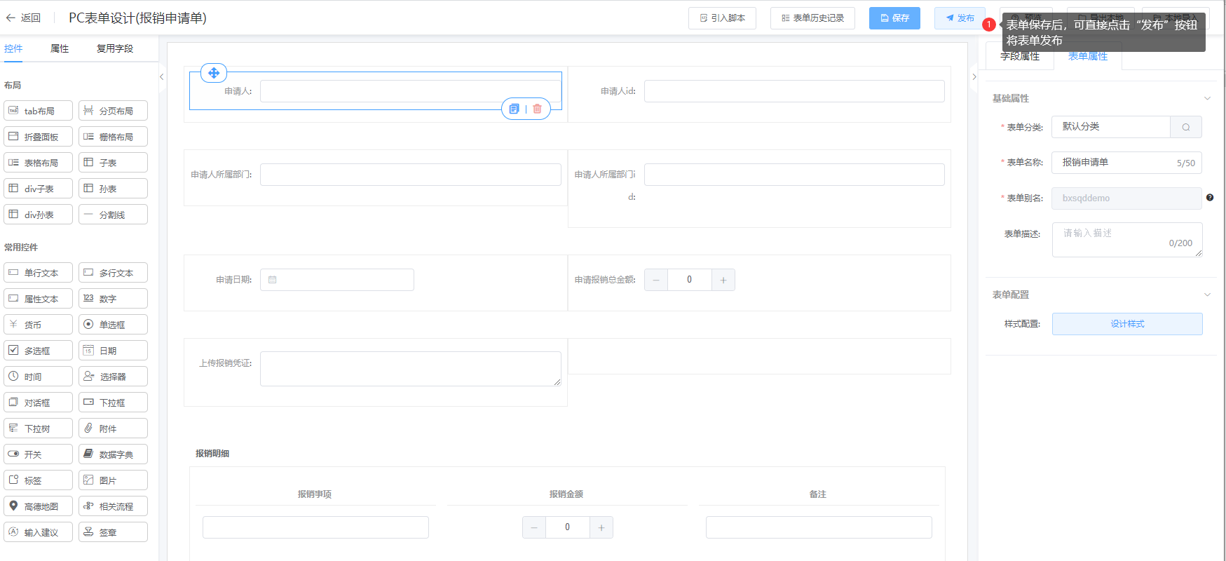 该模块为“费用报销表单”中使用到的控件配置操作步骤: