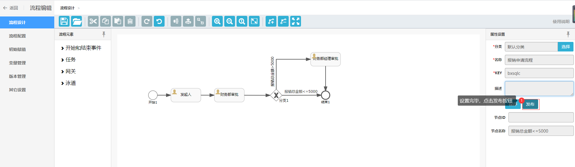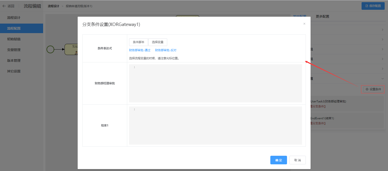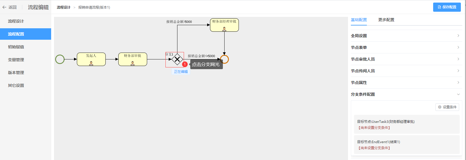 设置分支条件:当报销总金额大于5000时,流转到“财务部经理审批”;