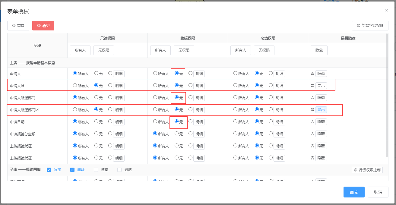 第三步:设置表单权限:将申请人、申请人所属部门、申请日期设置为只读,将申请人id、申请人所属部门id设置为隐藏;