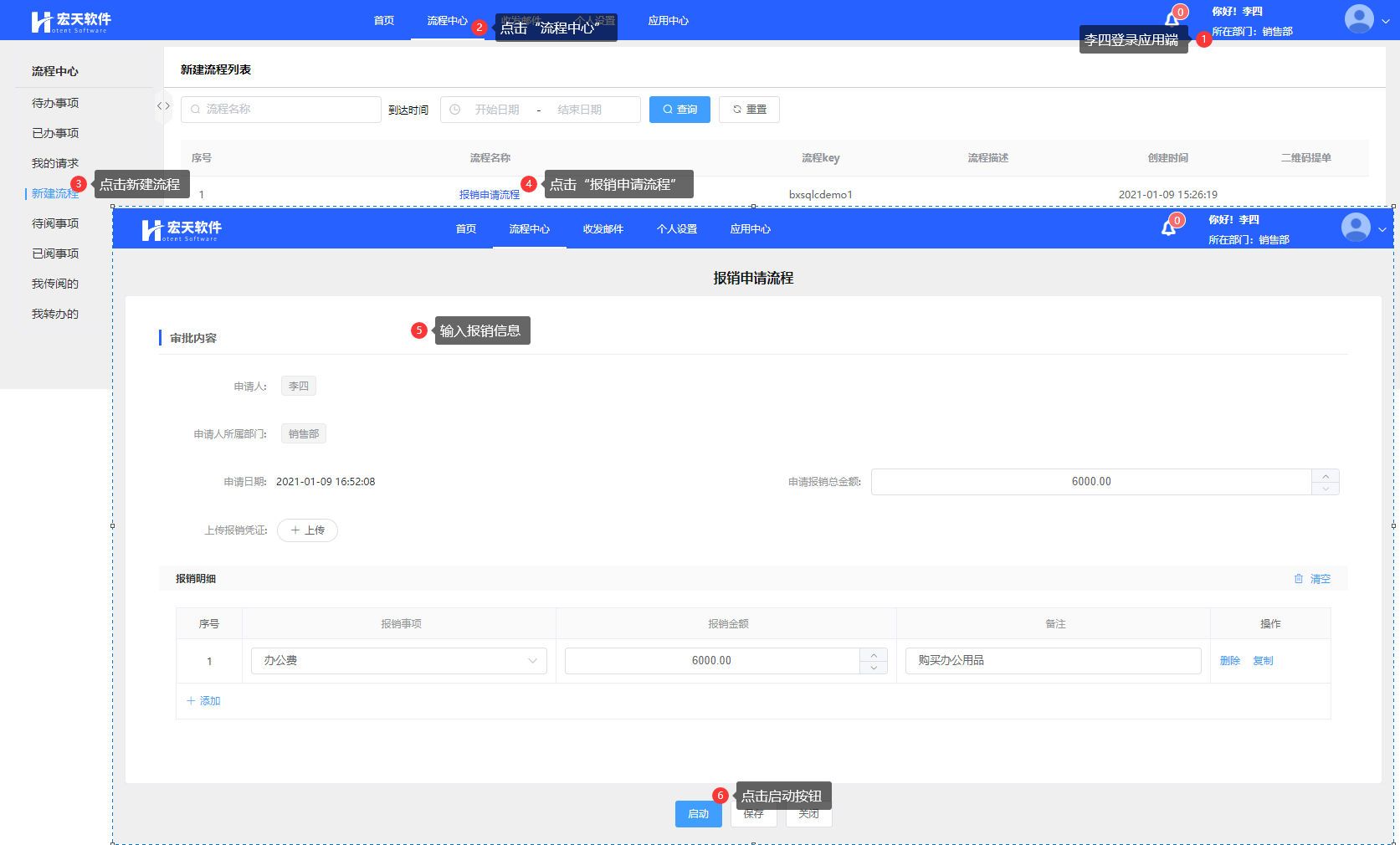 例:使用李四的账号发起报销申请流程;
