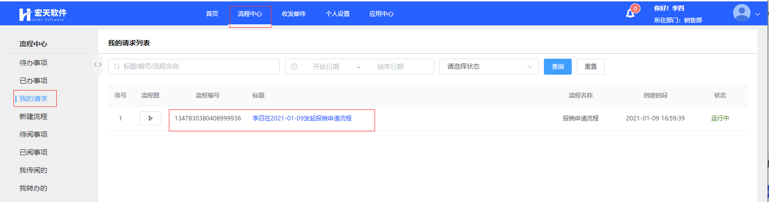 2、对流程的发起者,可在【流程中心】->【我的请求】列表中查看流程流转情况: