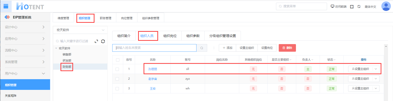 第十一步:设置用户的主组织(组织架构中可能会存在一个用户属于多个组织的情况,我们可通过设置主组织来设置用户的默认组织)