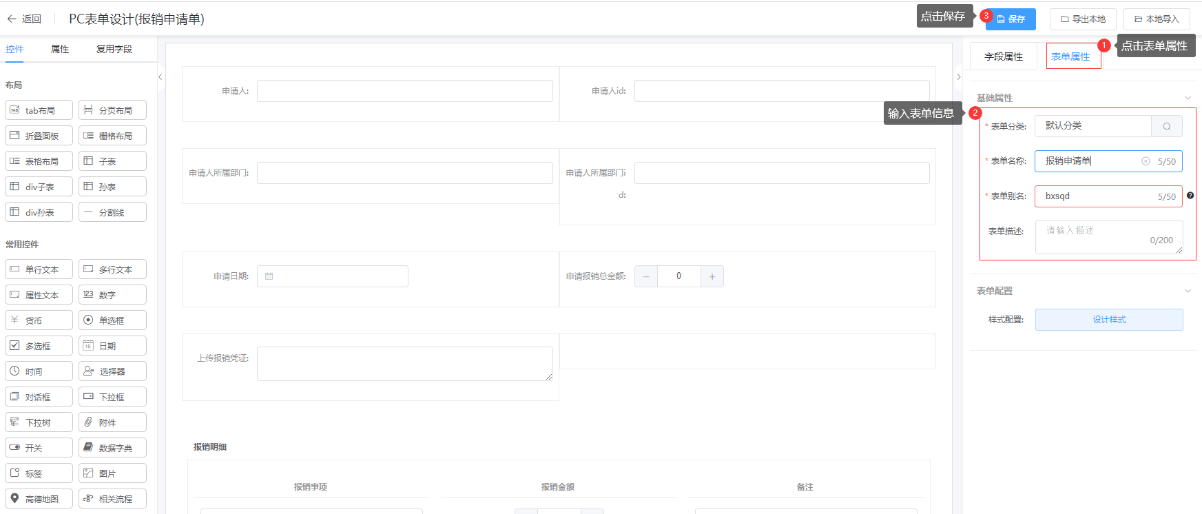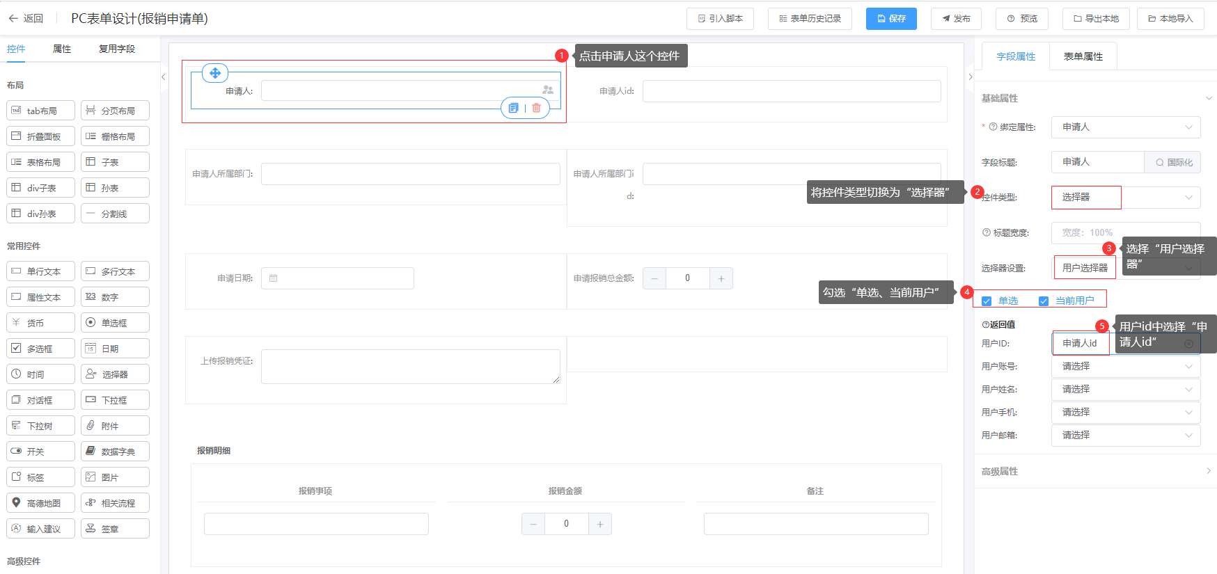 该模块为“费用报销表单”中使用到的控件配置操作步骤: