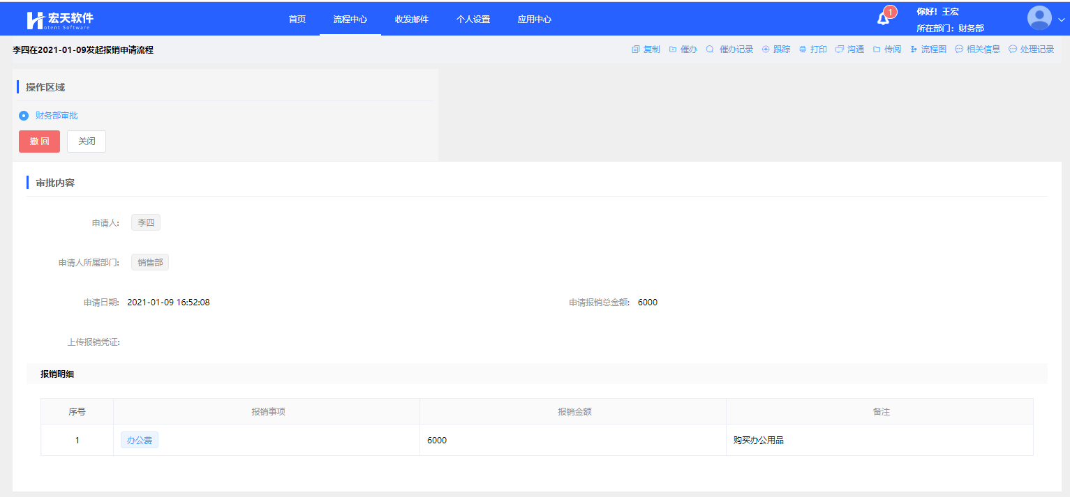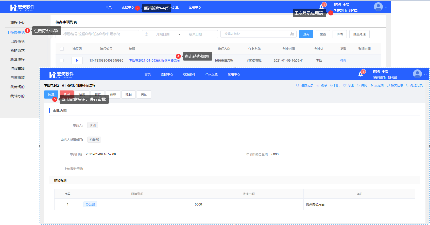 “王宏”用户登录后,在【流程中心】->【待办事项】列表中找到并打开审批任务。在表单下方的“审批操作”模块中,填写审批意见,并选择审批动作。