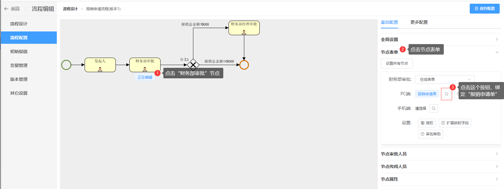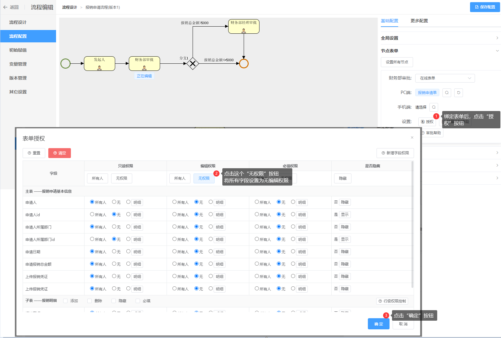 重复上述步骤,将财务部经理审批节点绑定报销申请单,并设置表单在节点审批时的字段为只读状态