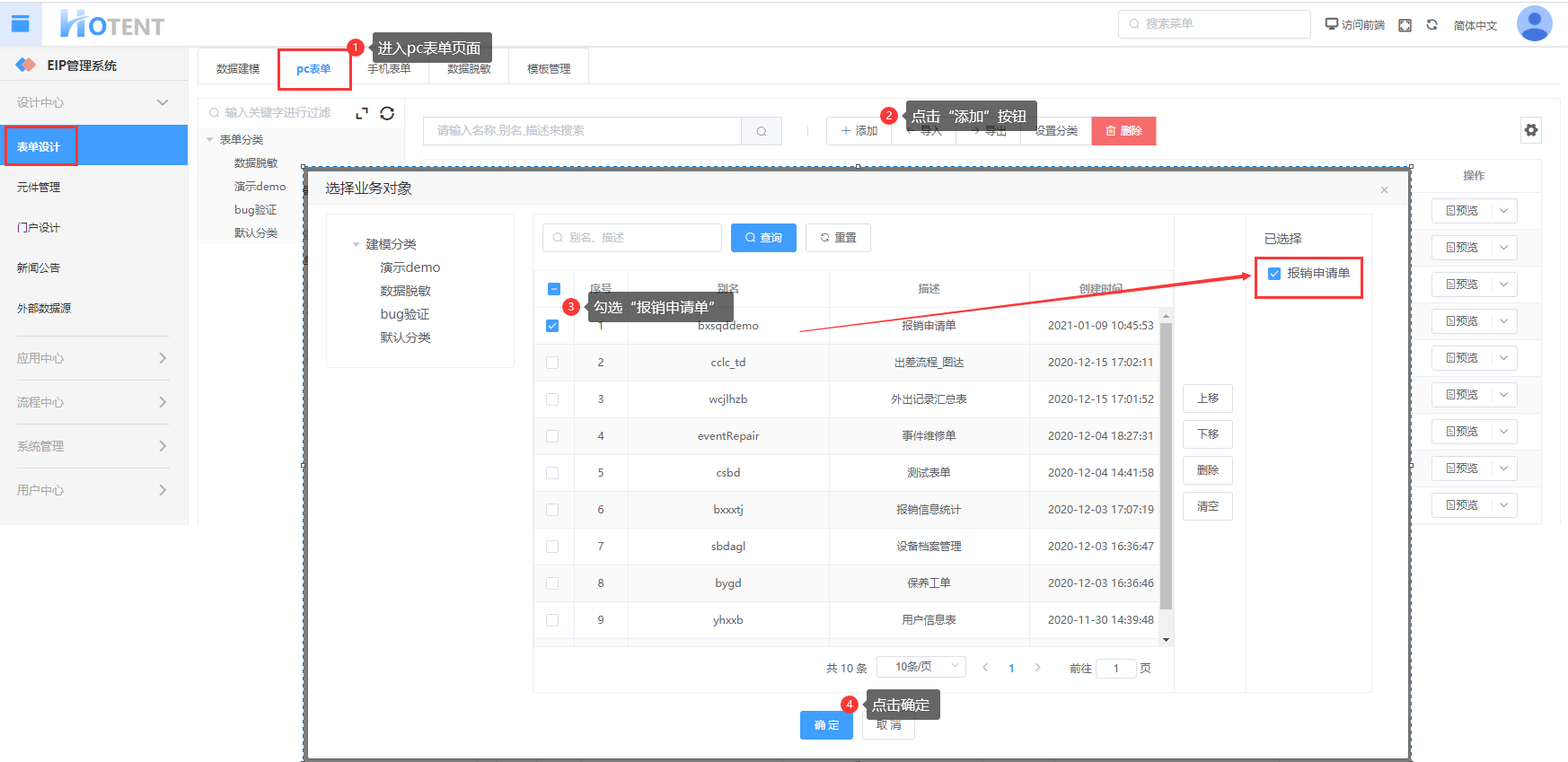 第二步:点击【PC表单】页面中的“添加”按钮,打开【选择业务对象】页面,选择“报销申请单”,点击“确定”
